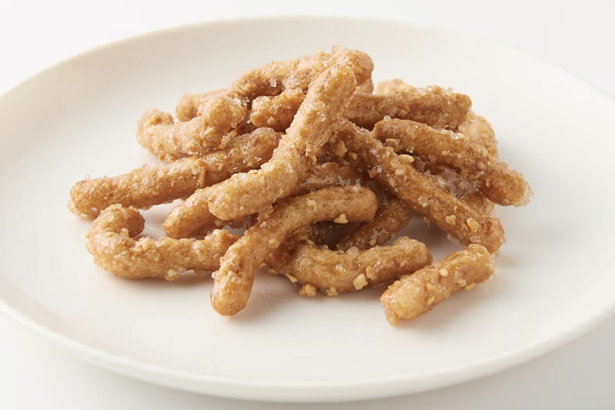 A traditional cookie-like snack, Karinto is a deep-fried treat made of naturally fermented wheat flour dough and various coatings. This Muji interpretation is the most typical. It’s covered in syrup and crushed peanuts. Muji offers the less-common but still popular Okinawa brown sugar version as well, which is also a must-try.