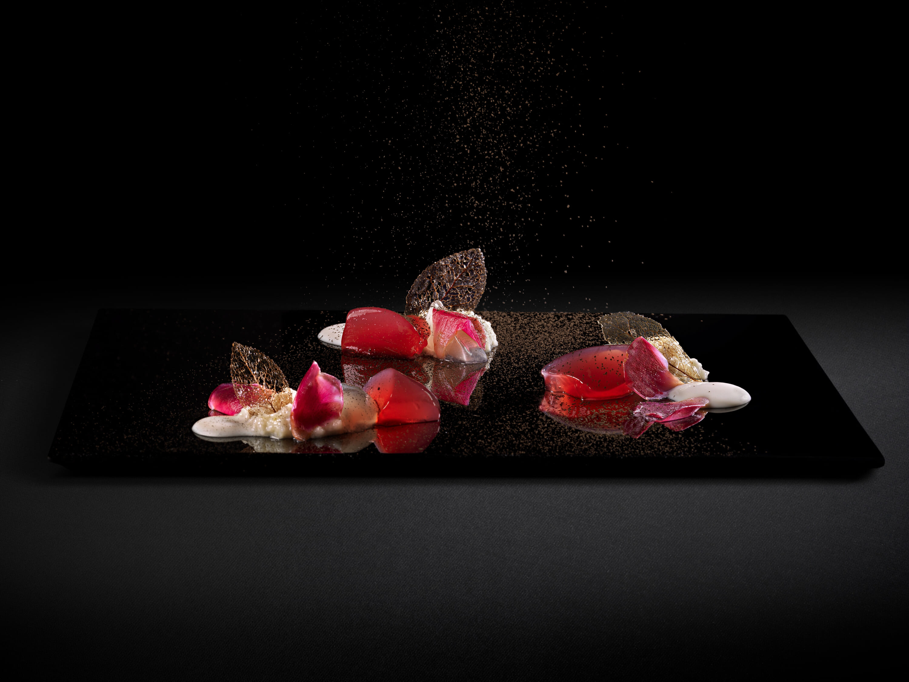Narisawa Dessert dish “Camellia and Koji,” which follows the ancestral technique of harnessing camellia ash to cultivate koji mold.