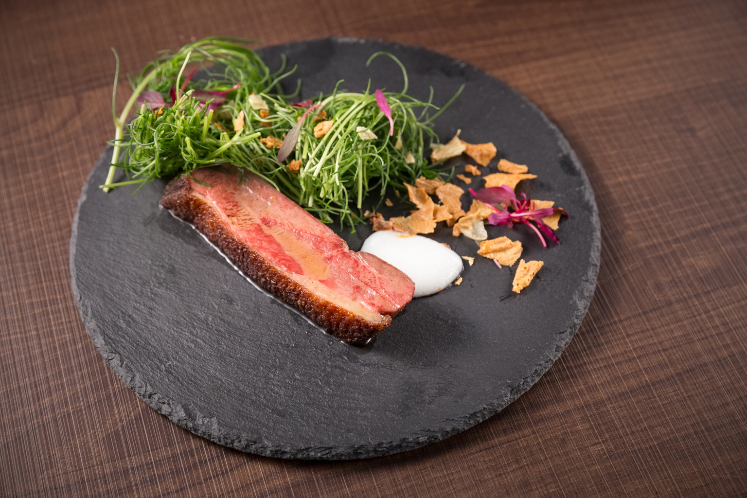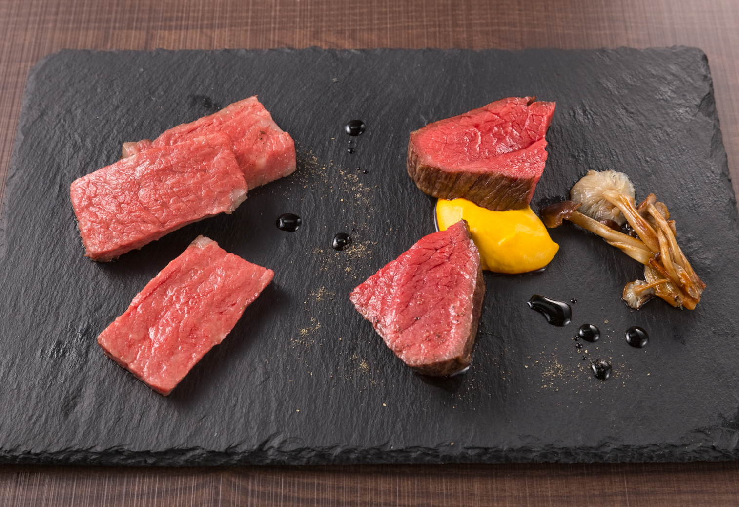 For those who might be unfamiliar with this particular variety, Matsusaka beef is considered to be one of the most famous kinds of beef in Japan, up there with the likes of Kobe and Omi beef. Known for their high fat-to-meat ratio, the cattle come from the Matsusaka region of Mie Prefecture, where they are raised under strict supervision and attention by their caretakers—a rearing process that includes a specialized diet that includes ground wheat, barley, soybean leaves and beer (to increase their appetites). They are also walked daily, massaged and treated to sunlight baths—a process designed to keep the animals relaxed, calm and happy, which in turn provides a more tender meat.