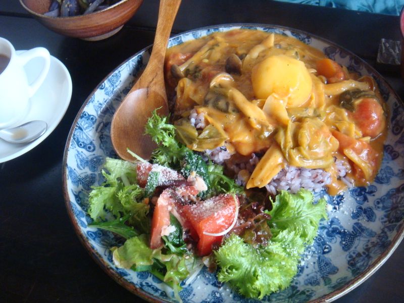 Besides the cosy interior, the food offered is the other reason to visit. All the dishes are made from organic ingredients, and you can choose from a variety of fish-based, meat-based, or curry meals and entrees. I highly recommend trying the vegetable curry, which comes with a hearty portion of seasonal vegetables (pumpkin, potatoes and baby radish this time), on a bed of rice with leafy greens on the side. The vegetable soup is a great alternative for a light meal, in a light consommé form.