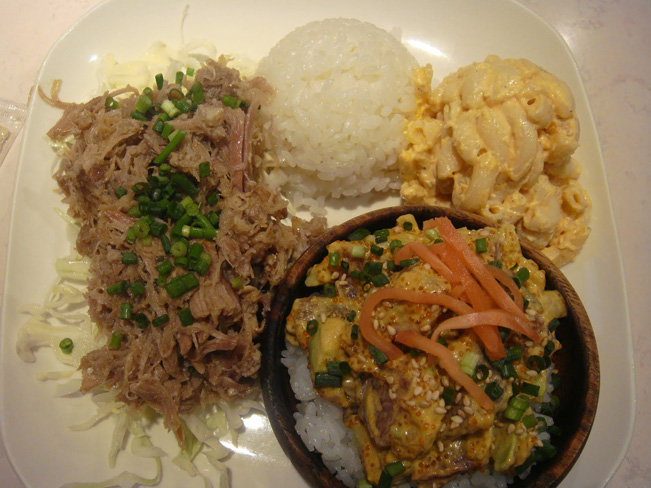 Traditionally, kalua pig is cooked whole in an imu, an underground oven utilizing hot volcanic rocks and banana leaves. The pig is left to steam all day in the imu, and when it is unearthed the meat is imbued with a wonderful smoky flavor, leaving it tender from its own juices. The kalua pork at Ogo is so juicy and flavorful with real smoke flavor that it leaves you wondering if the owners actually managed to find an earth spit somewhere in this concrete city.