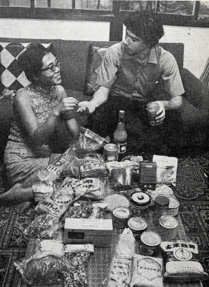 At their Meguro-ku home, their shelves are stacked with genmai (pure barley), pure breads, raw sugar, canned nut meat, gluten “meats” (read soy derivatives), comfrey (weeds) buns, whole wheat spaghetti, soyu potage and bottled water with mineral stones guaranteeing purity.