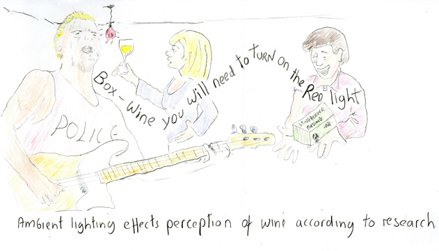 Recent research even focused on ambient light and its effects on the taste of the wine. With the color of the wine masked by black glasses, wines were tasted under blue, green, red and white light. Apparently people preferred the same wines tasted under red or blue. In fact, the subjects were willing to spend over one euro more for the same Riesling tasted under a red light versus a green light. So it’s best to avoid red light areas!