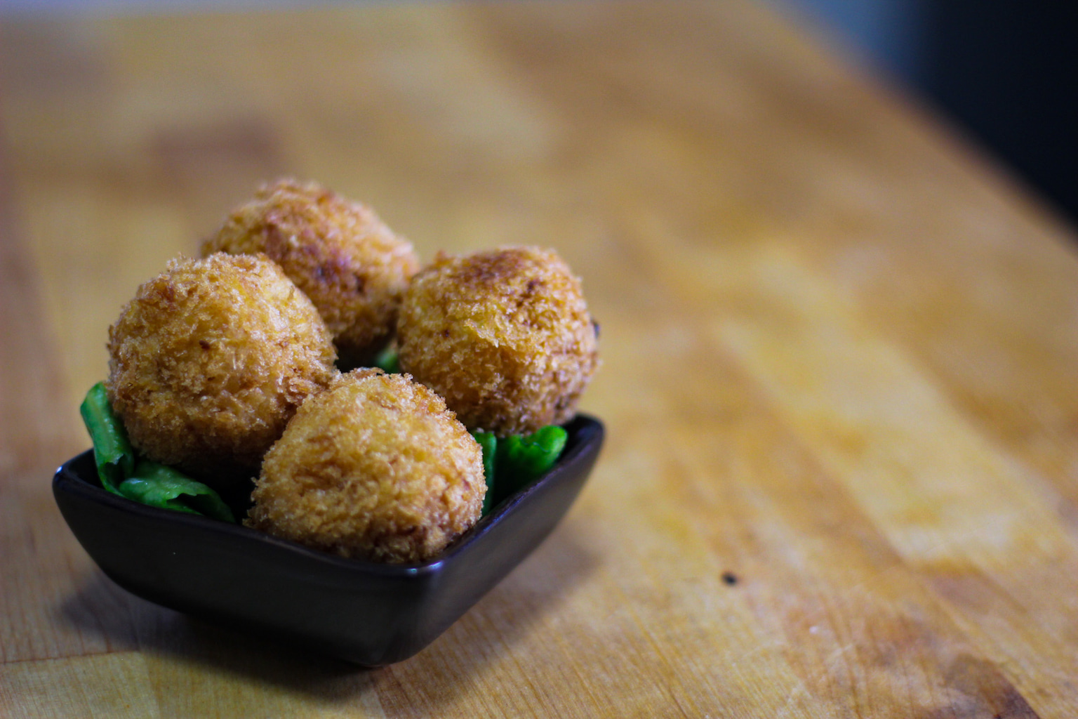 After around 15 minutes remove the pumpkin balls from the fridge and prepare for frying. Coat the balls in flour and then dip them in a beaten egg before coating the balls in panko crumbs and setting them aside to be fried. Once all the balls are prepared, heat up some oil, enough to cover the balls once submerged, and start frying the korokke a few at a time. It’s important not to crowd the pot at this stage. Once the korokke are golden brown, place them on a wire rack to cool and hit them with a little salt. Perfect pumpkin Korokke. While delicious alone, the round pumpkin powerhouses are also amazing when paired with a little tonkatsu sauce.