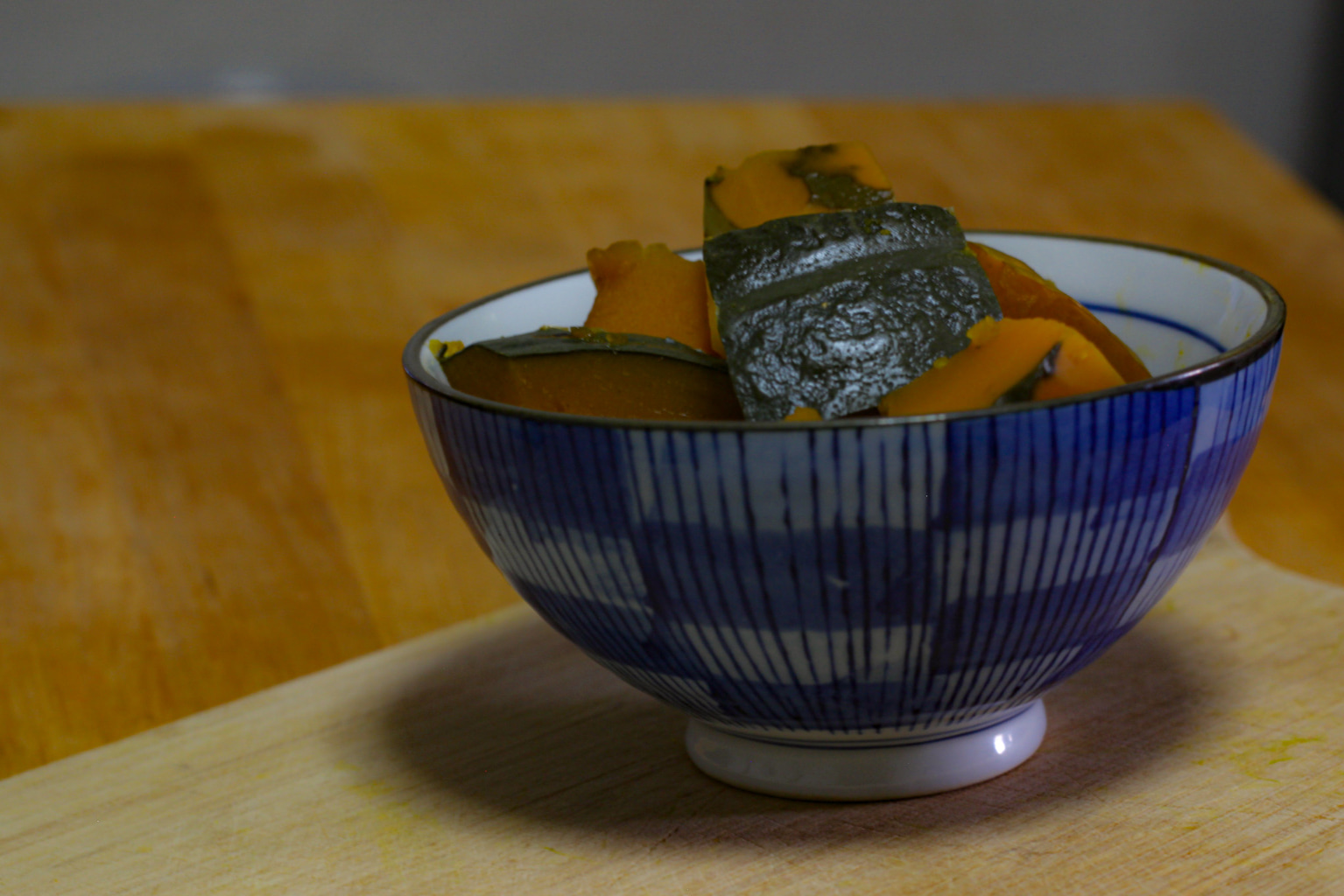 Once all the seasonings are mixed in well, add your pumpkin to the mixture and turn the heat down low. When making nimono a low heat is your greatest ally as it gives whatever you are stewing, in this case pumpkin, enough time to soak up all the flavors of the broth before it cooks completely. Keep the pumpkin simmering on a low heat for around 20-30minutes or until the pumpkin is easily pierced with a fork. Remove from the heat and serve. The broth that the pumpkin was cooked in isn’t for drinking and can be tossed out once the pumpkin is complete.