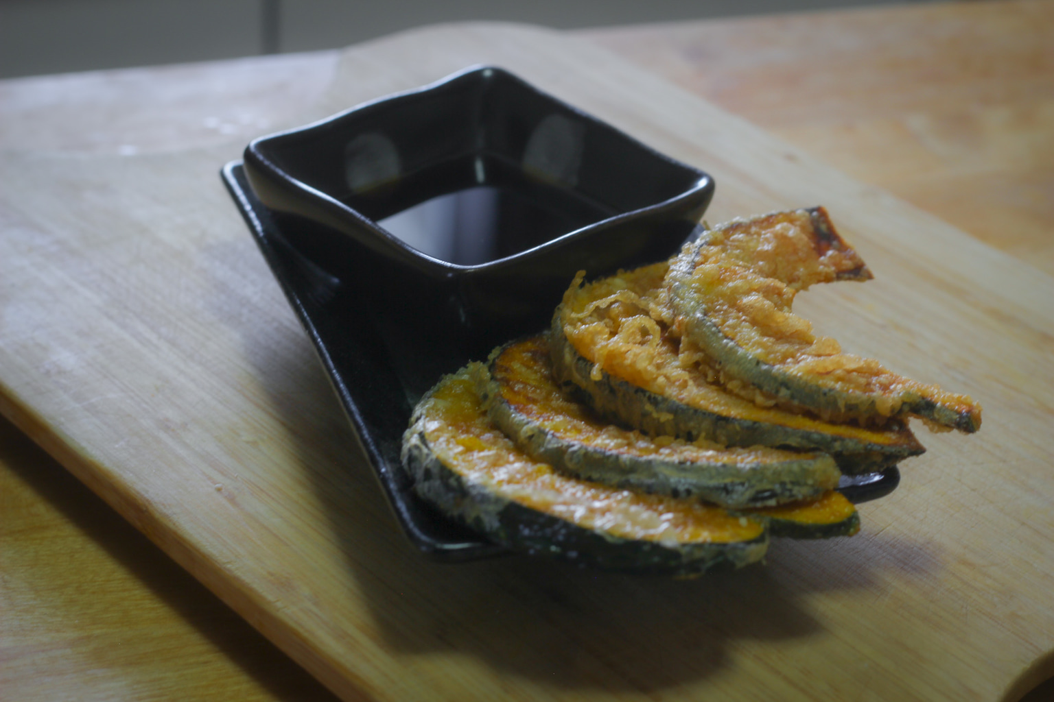 Temperature control is essential when cooking tempura. It’s said that the perfect tempura is made between 170-180 degrees C°. For those who have a kitchen thermometer now’s the time to use it. For the rest of us, we’ll just have to guess. Once the oil is hot place, the pumpkin into the batter and then into the hot oil. It’s important not to overcrowd the pot as that will lead to greasy undercooked tempura. Once the tempura has become a golden brown place it on a wire rack to cool. Repeat until all the pumpkin has been cooked and served with the dipping sauce of your choice.