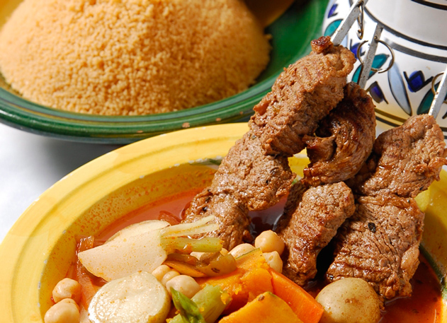 Chef Mondher recommended soft handmade tabuna bread to start, served with a side dip of harrissa, a hot pepper paste that is traditionally served before meals. To cool our palates down we were also served a green salad of olives, tomatoes and egg plant seasoned with paprika. Next came a surprising plate of brik: think huge, Tunisian-style spring rolls. The crispy pastry was filled with a delicious whole soft egg, Parmesan cheese, parsley, potatoes and kipper—a challenge to eat without spilling the yolk on your fingers, but well worth the effort.
