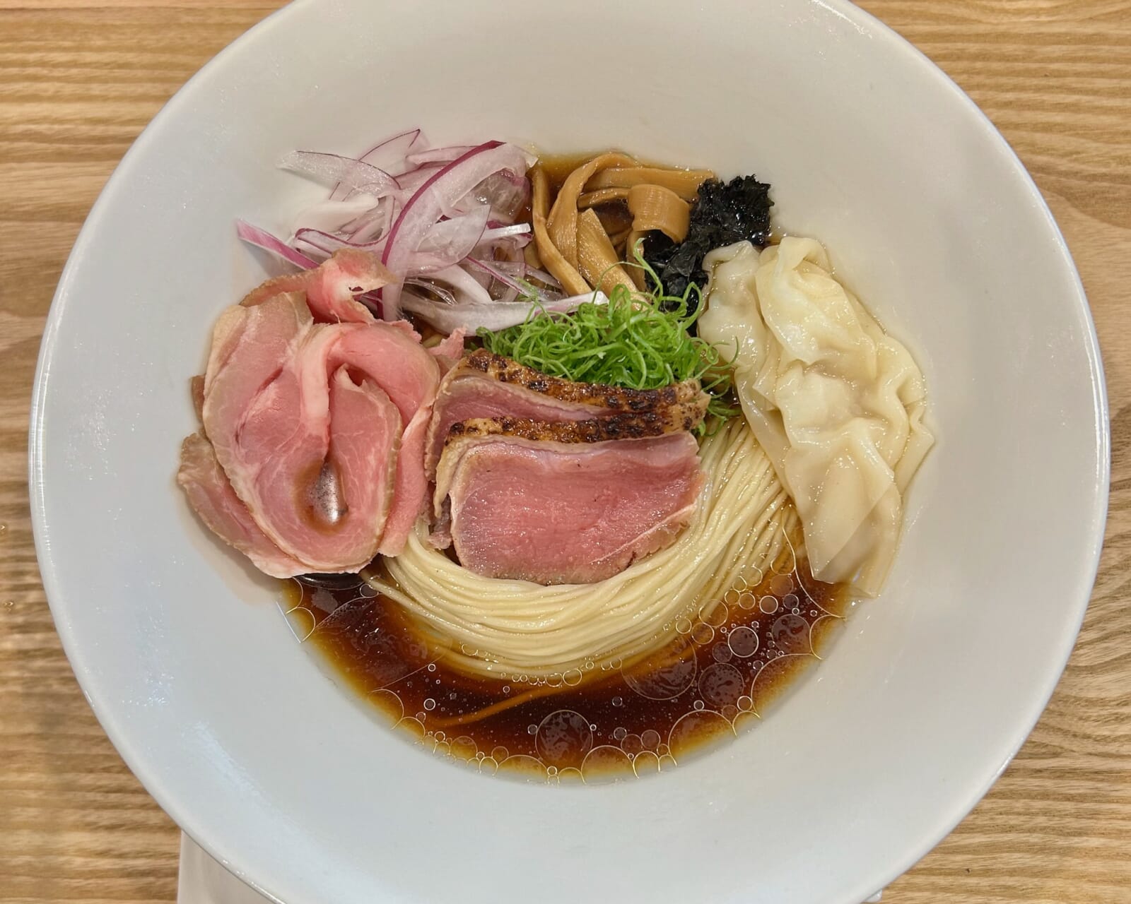 Toppings of slow-roasted duck slices evoke fine dining more than a typical ramen joint. These are complemented by carefully sliced menma (bamboo shoots) and thinly sliced deli-style chashu. Perhaps the most memorable element is the addition of squid wontons, whose texture and flavor add complexity to an already flawless bowl.