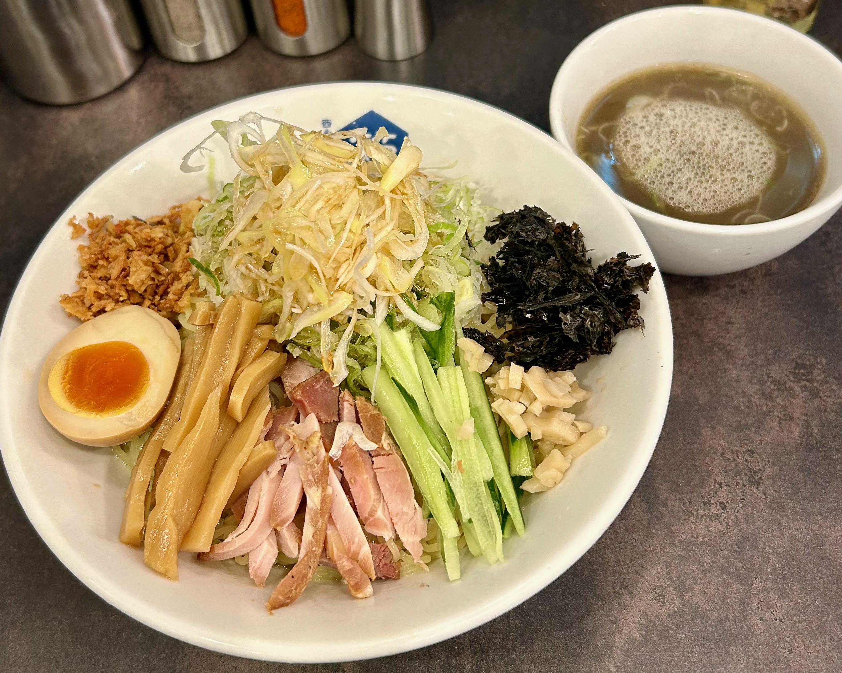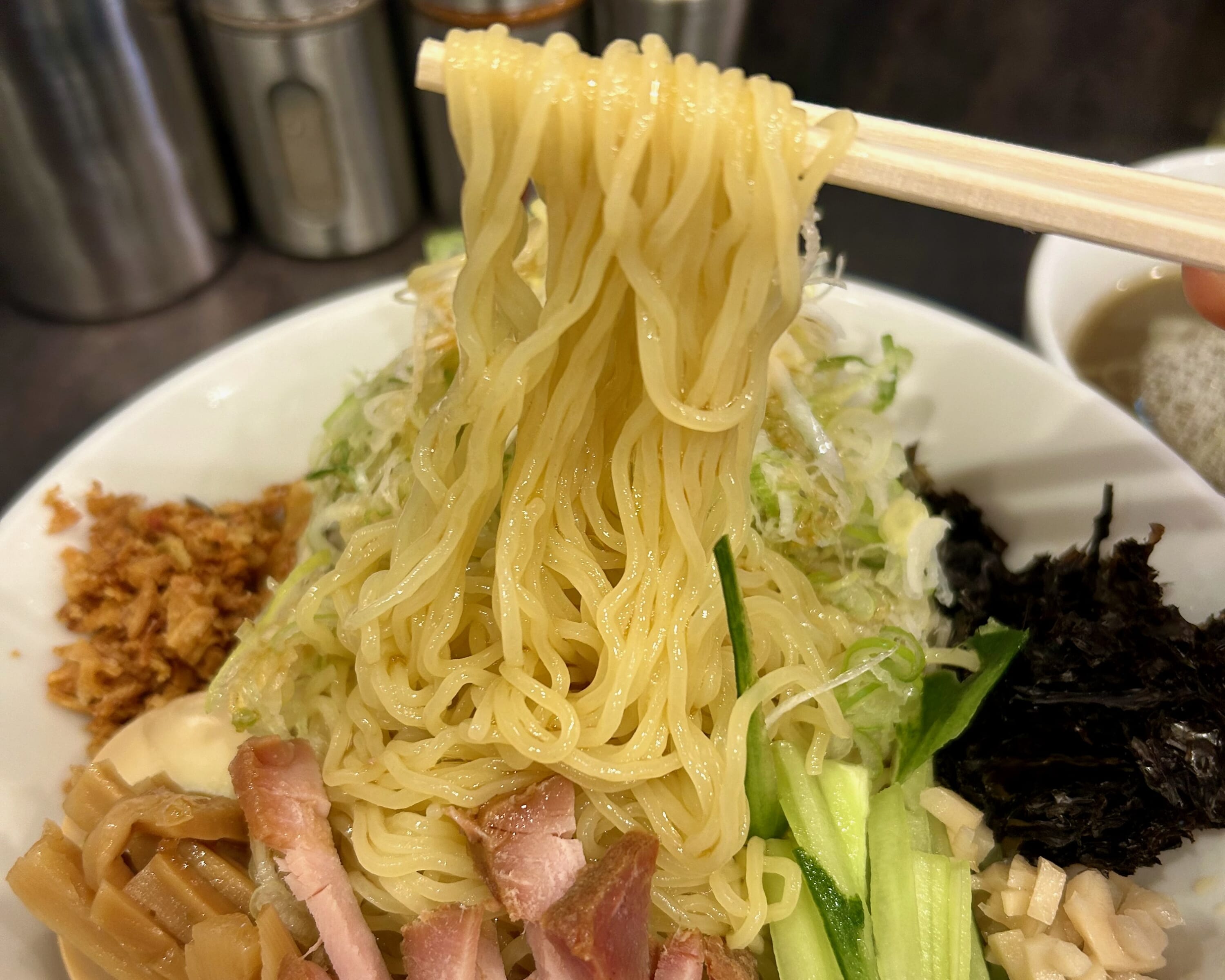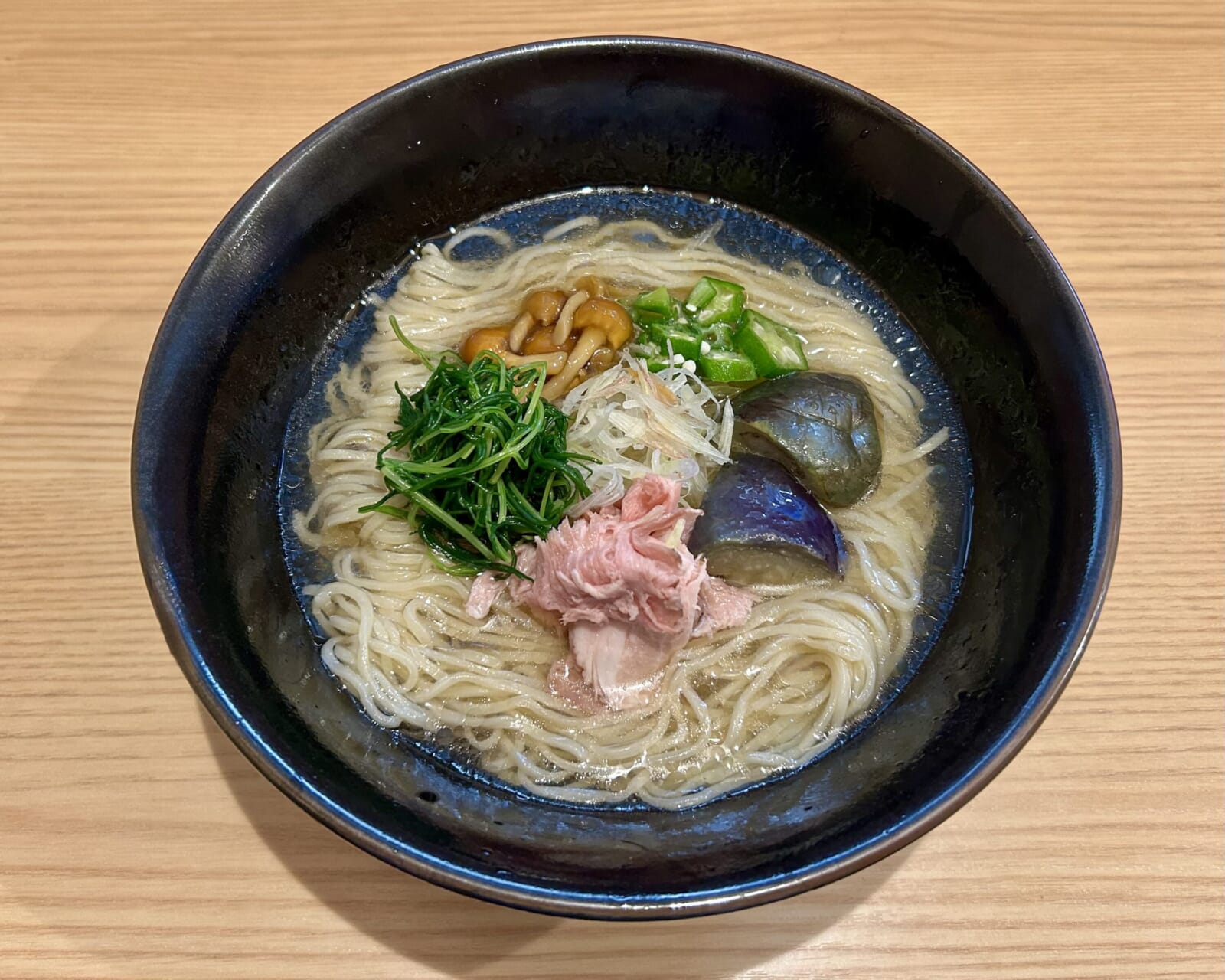 Since opening in 2023, Ramen Matsui in Shinjuku has quickly soared in popularity. Its summer ramen offers an exquisite blend of flavors and beautifully crafted noodles. Its chilled ramen features aji niboshi (dried horse mackerel) as a standout ingredient; unlike the more common sardine-based dried fish broths, aji brings a meaty richness. The dark soy sauce hue hints at the depth and intensity of the broth.