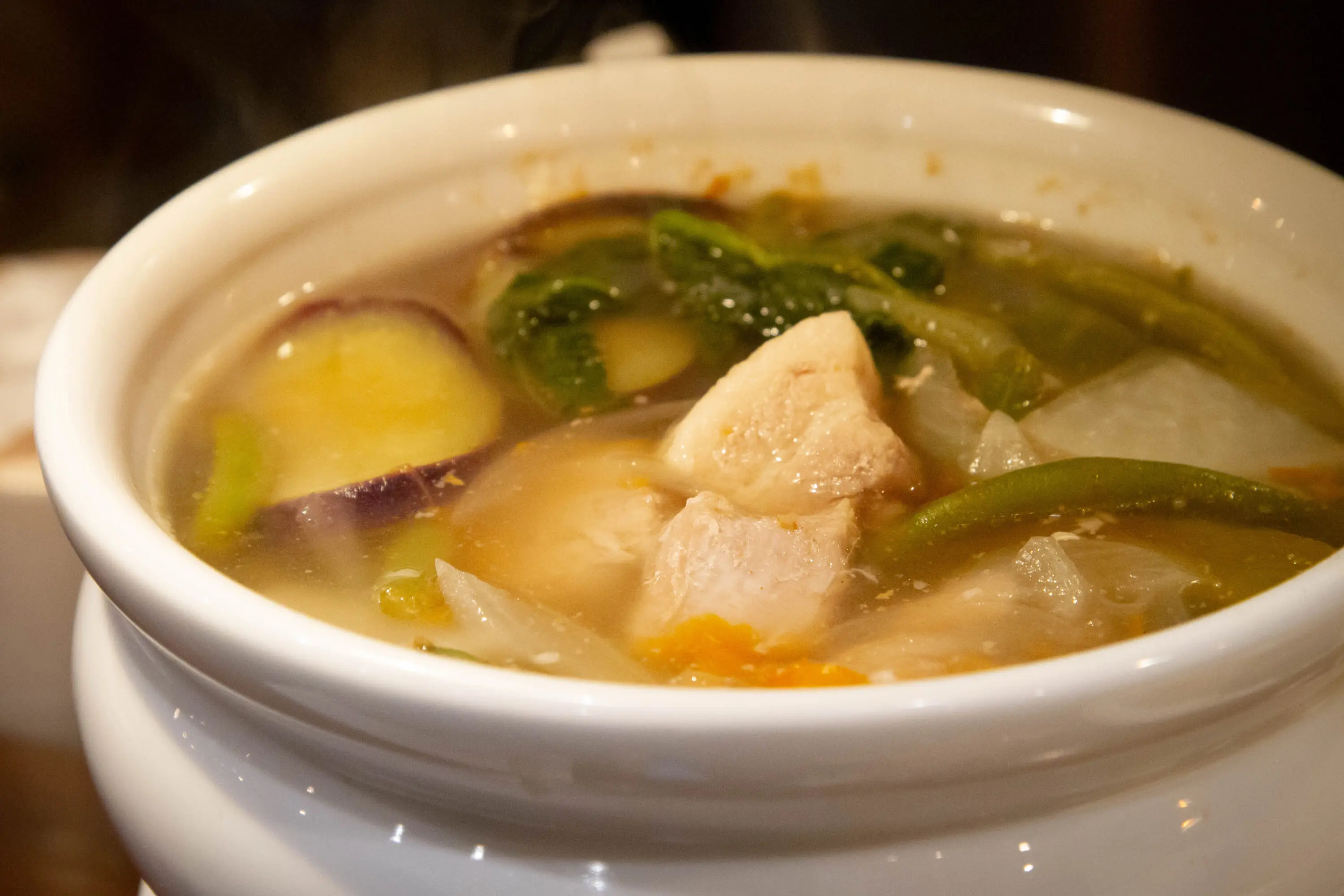 In addition, you’ll find sinigang, a soup known for its sour flavor. It’s filled with a variety of vegetables, including green beans and eggplant, accompanied by tender pork belly slices that add a great richness to the dish.