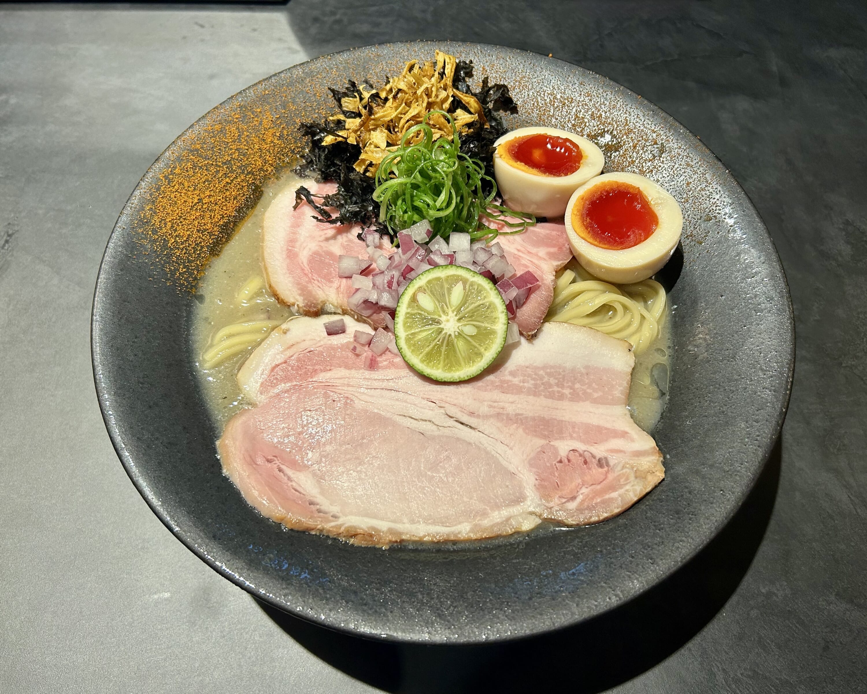 The noodles are crafted from specialty Hokkaido wheat, paired with a shoyu blend of four distinct varieties. The broth showcases remarkable attention to detail, built on a base of black Satsuma chicken prized for its rich umami and high amino acid content, as well as for a juiciness that’s locked in during the cooking process. The same level of care is extended to the eggs, which are sourced from Nasu, Tochigi Prefecture, where chickens are raised on a specially formulated feed to enhance flavor.
