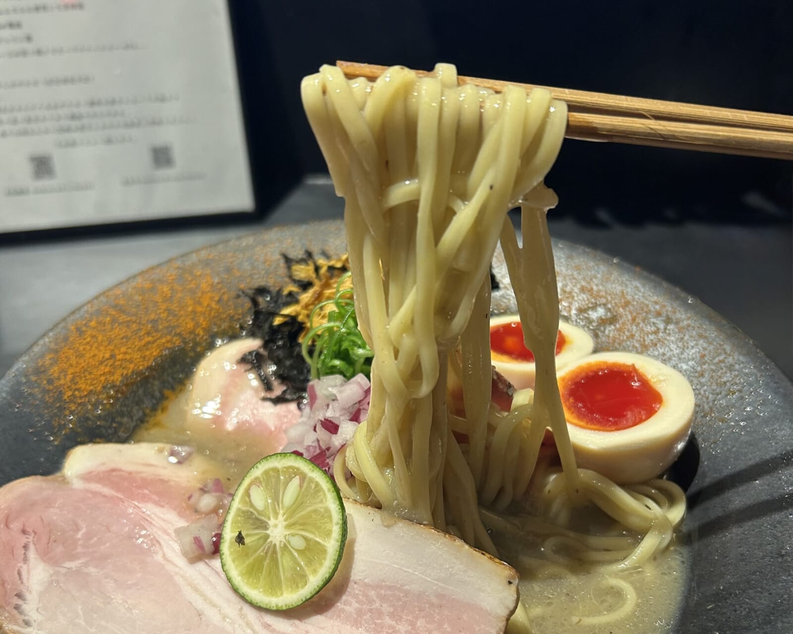 The specialty here is a creamy toripaitan niboshi ramen, blending chicken and dried fish. The chicken lends a smooth, velvety texture, while the niboshi adds a punchy depth. Despite its rich appearance, the broth is surprisingly light, making it easy to finish down to the last drop. The firm, thin noodles provide just the right contrast.