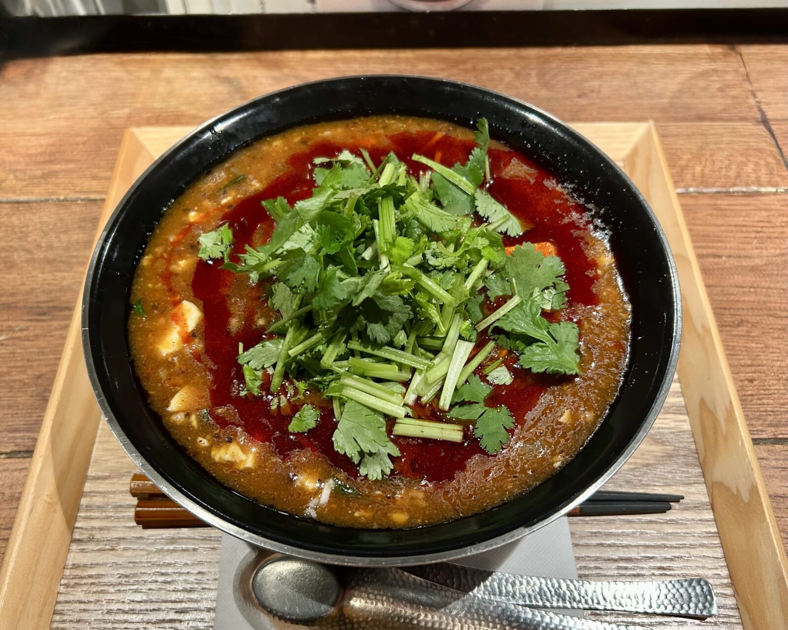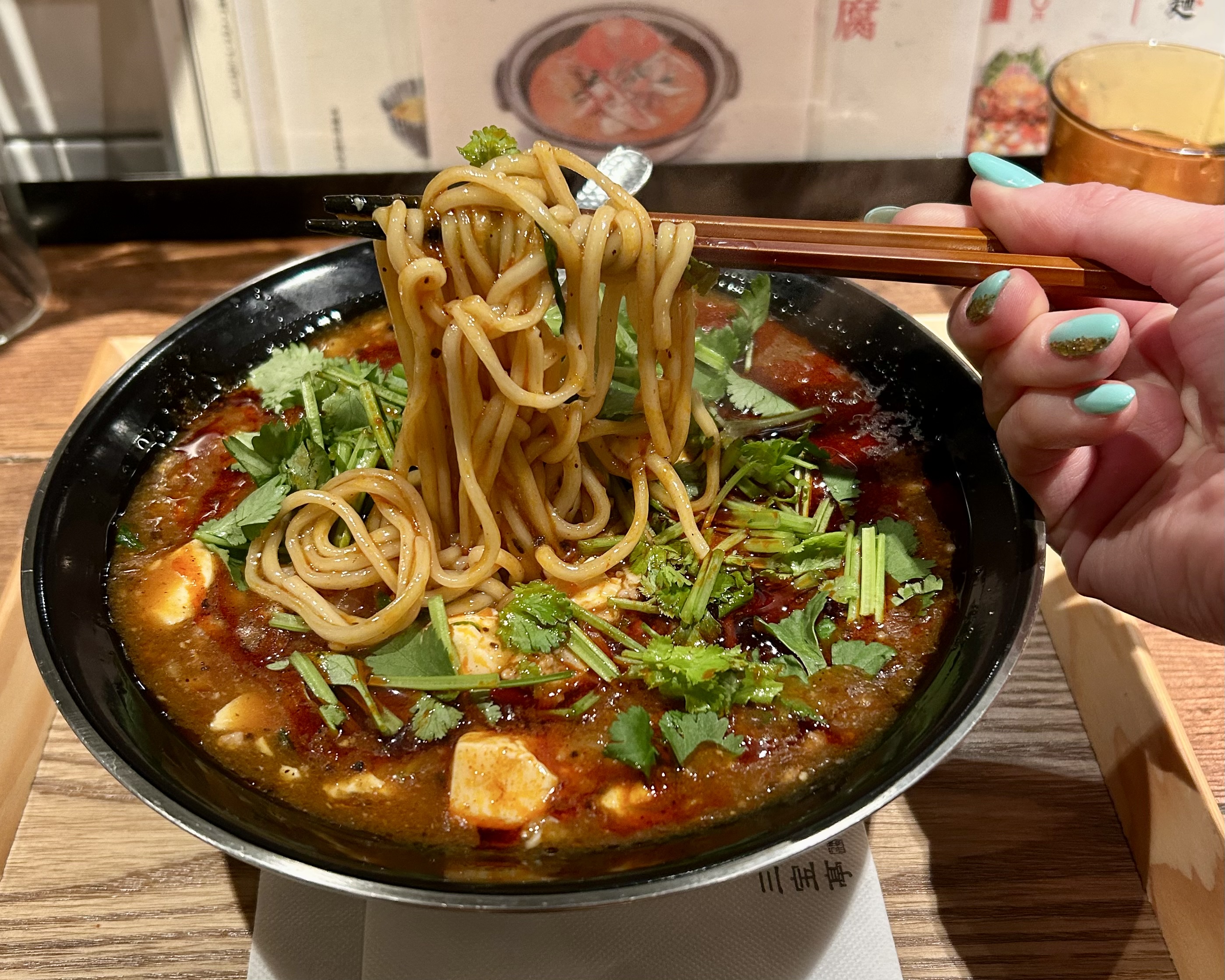For those torn between mapo tofu and ramen, Niigata Sanpo-tei Tokyo Lab offers the best of both worlds with its signature Mabomen. This decadent dish features thick, chewy noodles blanketed in a rich, spicy mapo tofu. Silky cubes of tofu are simmered in a savory sauce of doubanjiang (fermented broad bean and chili paste), garlic, ginger and Sichuan peppercorns. Guests can customize the spice level to their liking, with the “extra spicy” option reputed to challenge even seasoned chili enthusiasts. A topping of fresh cilantro is highly recommended, as its bright, herbal notes cut beautifully through the dish’s deep, lingering heat.