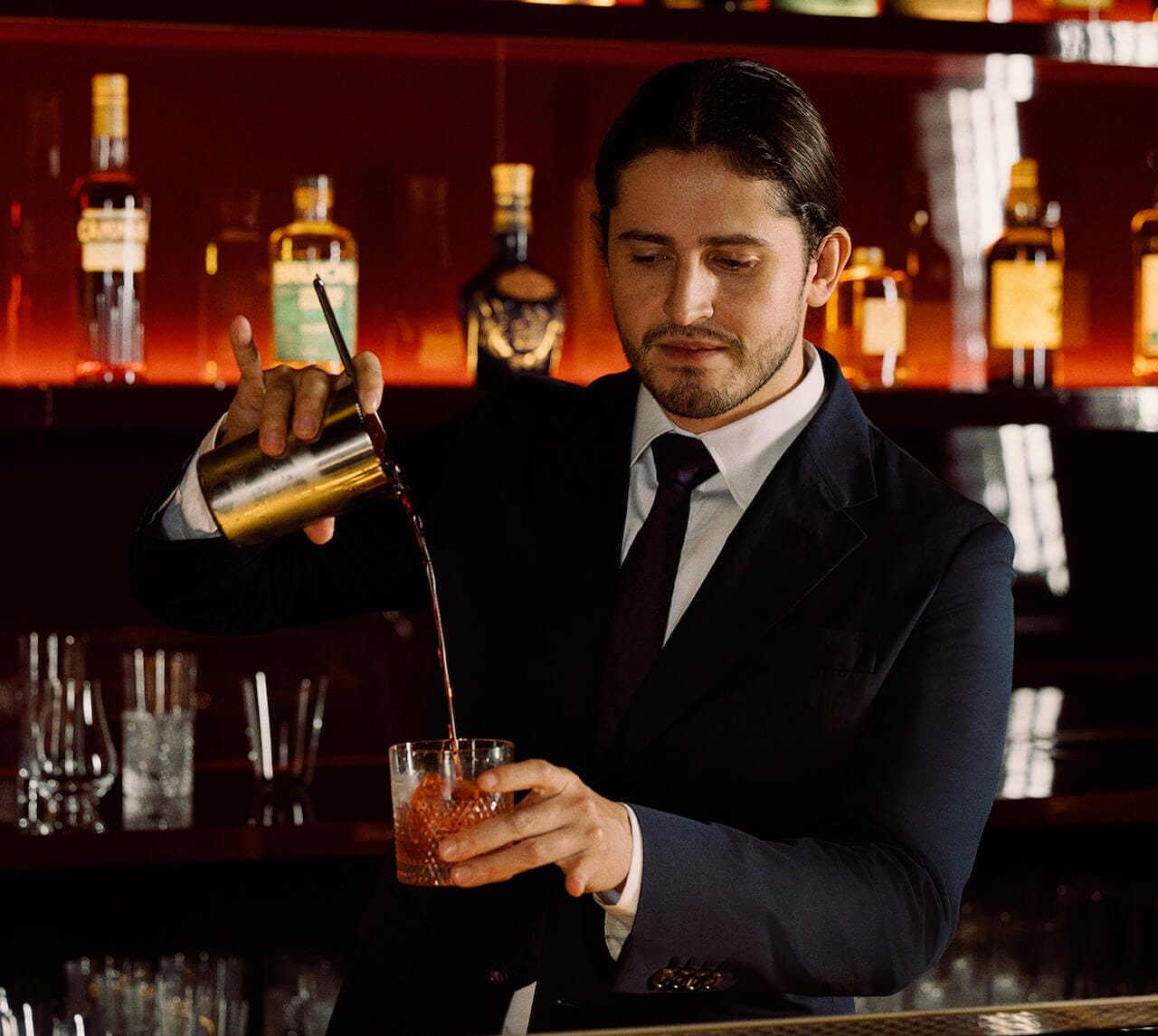 From there, drinks like Anima de Guerreiro reinterpret the classic negroni through the smoky spirit of mezcal, combining Clase Azul Guerrero scented with guanciale (salt-cured pork jowl), butter-washed Campari and Mancino Rosso for a cocktail full of depth and lingering warmth.