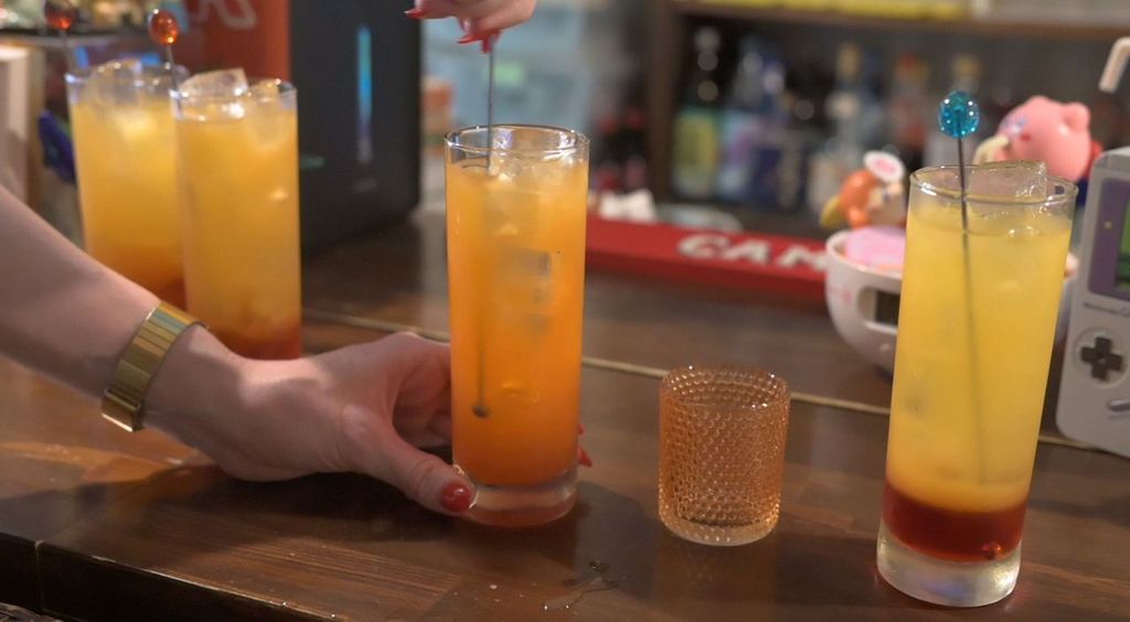Japanese snacks and 84’s unique refreshments — they have an alcoholic and non-alcoholic version — are also provided! Just above the bar, you can find a TV that continuously plays rare Nintendo commercials for various games.