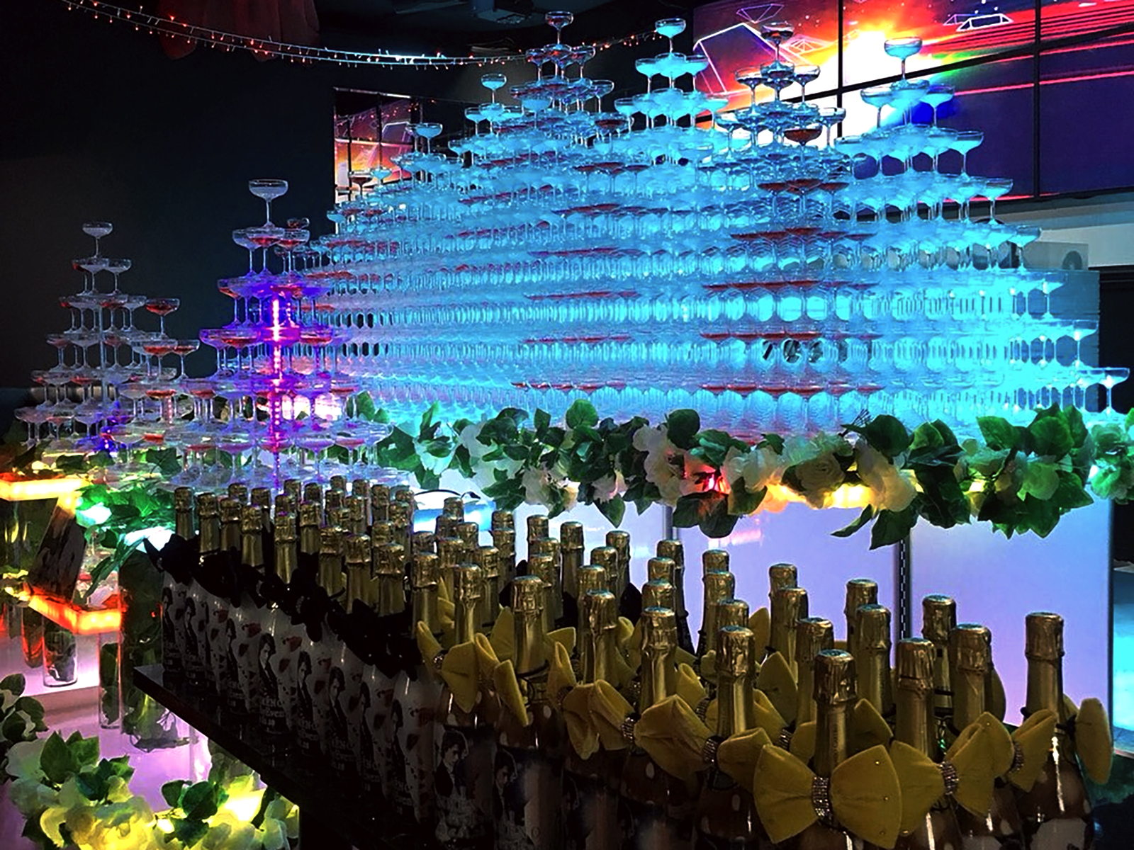 A spectacle of orishan glass towers.“Original Champagne,” a staple in all modern mizu-shobai venues in Kabukicho, are customized bottle designs allowing patrons to show their support of cast members — at a significant markup. Image courtesy of Gotham Tokyo.