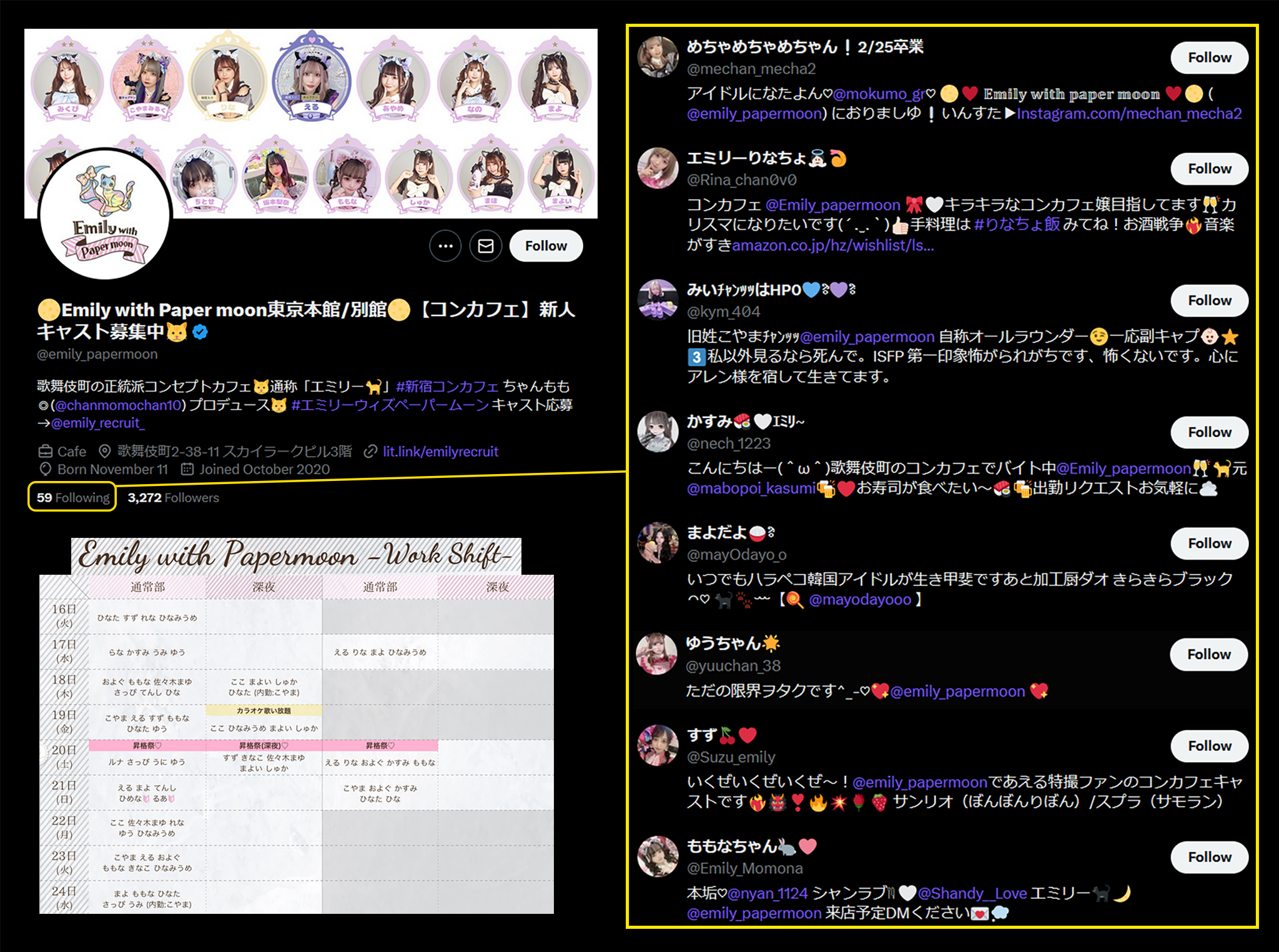On X (formerly Twitter), venues operate an official account, follow their cast members and publish daily cast schedules, allowing patrons to check in advance who they could potentially be meeting on any given day by going to the “Following” tab.