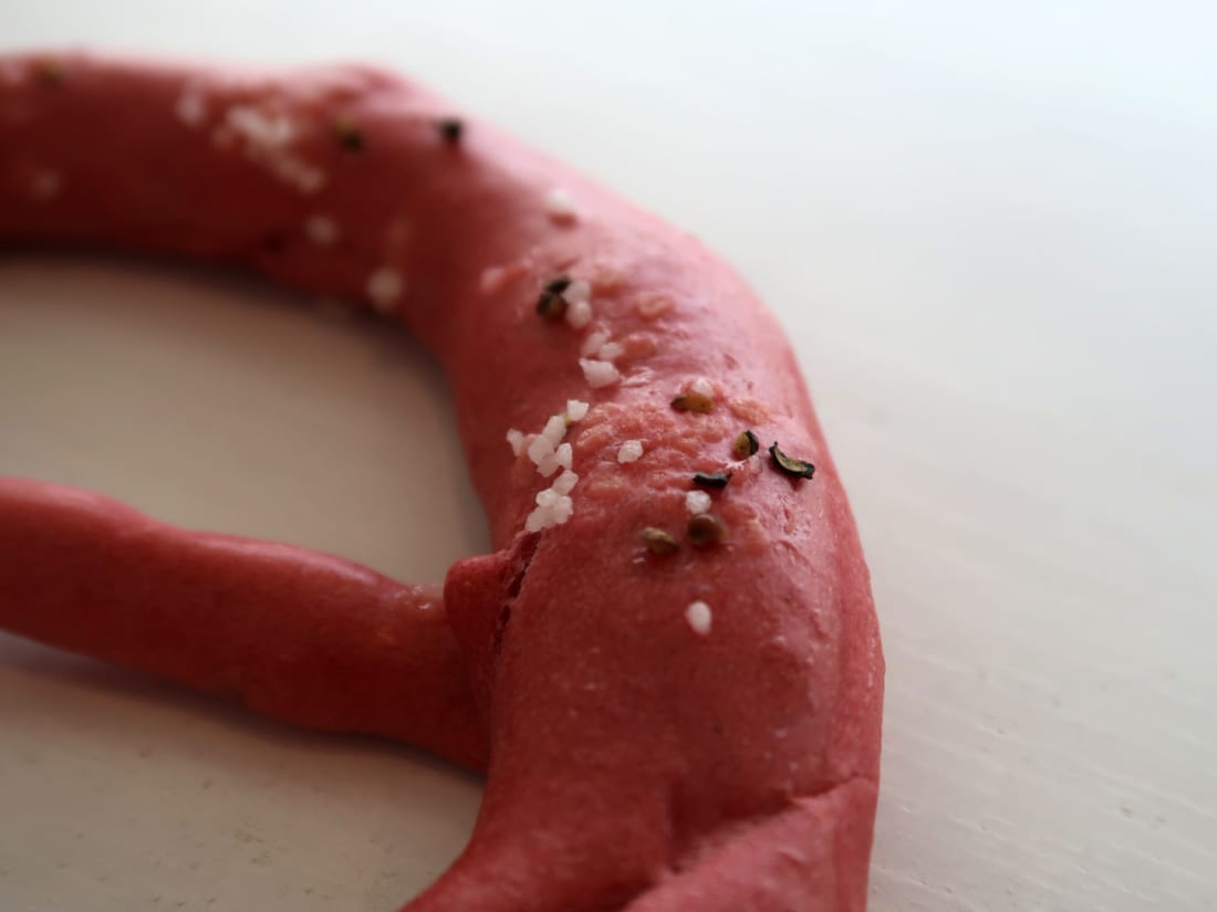 The pink pepper pretzel (they’re both listed on the menu using the German “bretzel”) is made using organic wheat flour and beet paste, giving it a deep pink, almost magenta color. It’s then sprinkled with rock salt and crushed black pepper.