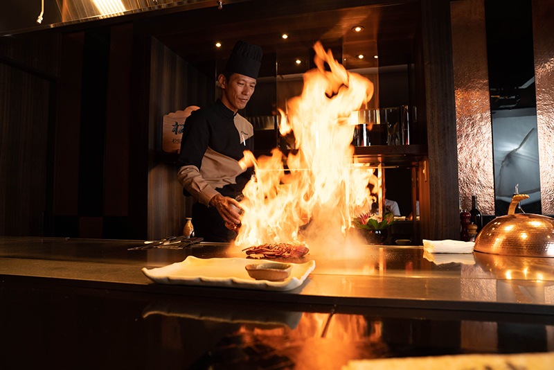 Inside the ambient teppanyaki restaurant, Chef Takahashi stands at wait behind the long grill. The immaculately polished grill, which shines like diamonds under the light, was built from two slabs of iron – one 500 kilograms, the other 300 kilograms.