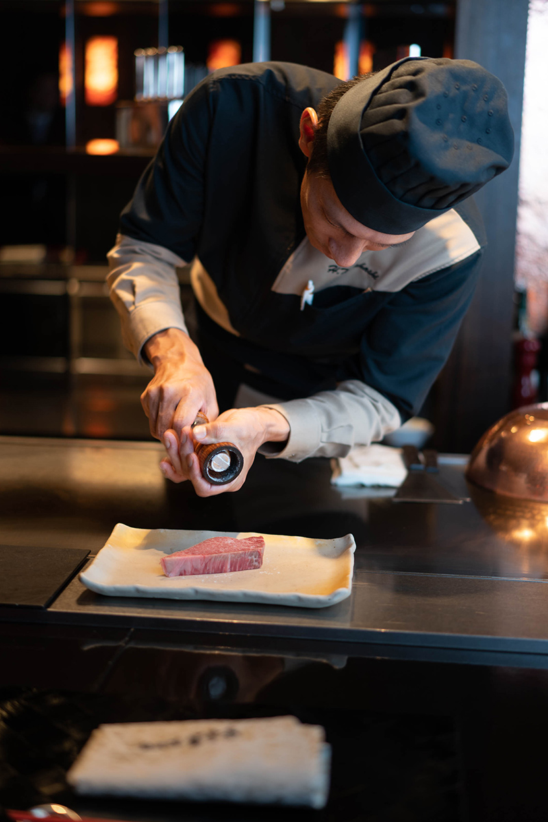 “For the chef, teppanyaki is not about the performance in front of the customers. The spirit of teppanyaki is the ability to delicately cook fine ingredients and provide our guests with high-quality and delicious food prepared properly,” says Takahashi. “The most engaging part of the teppanyaki experience is the interaction with customers, and the relationship we are able to share. Preparing a satisfying meal and creating an atmosphere where the client feels content is the most rewarding.”