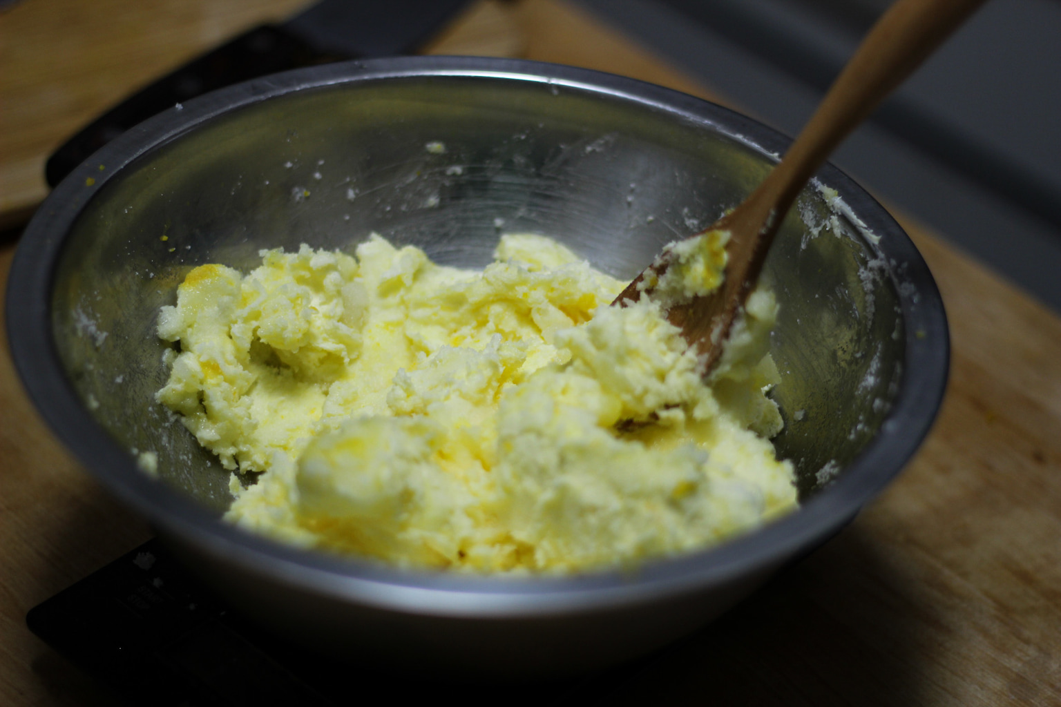 In a large bowl, whisk together your sugar and unsalted butter until it combines into a fluffy mass. In a smaller bowl, beat three eggs and slowly incorporate them into the sugar-butter mixture whisking each time. It’s important to do this part slowly to stop the eggs from curdling. Once all has been mixed in, fold in 215g of self-raising flour and continue to mix while slowly adding your yuzu zest and yuzu juice. Keep mixing until no more flour can be seen.
