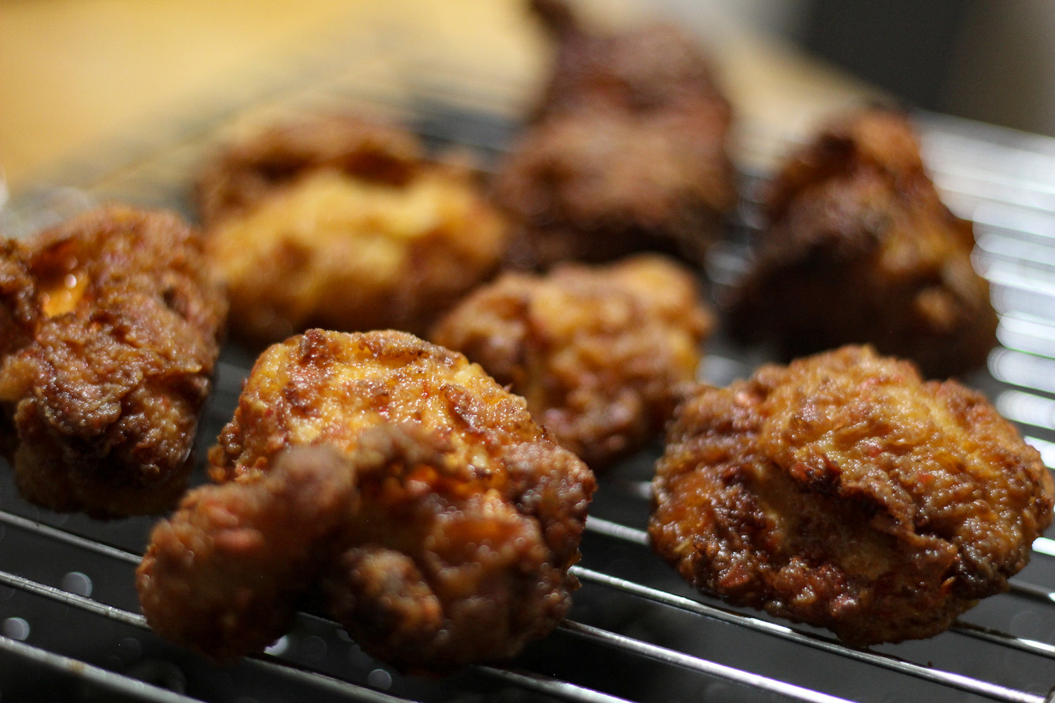 Heat a pot of oil to around 180 degrees and fry your karaage for around 2-5 minutes or until the karaage is crisp and golden brown. Leave the karaage to sit for a few minutes after it leaves the oil — this allows for the karaage to finish cooking in its own heat. The size of your karaage pieces will change the cooking time, so be careful.