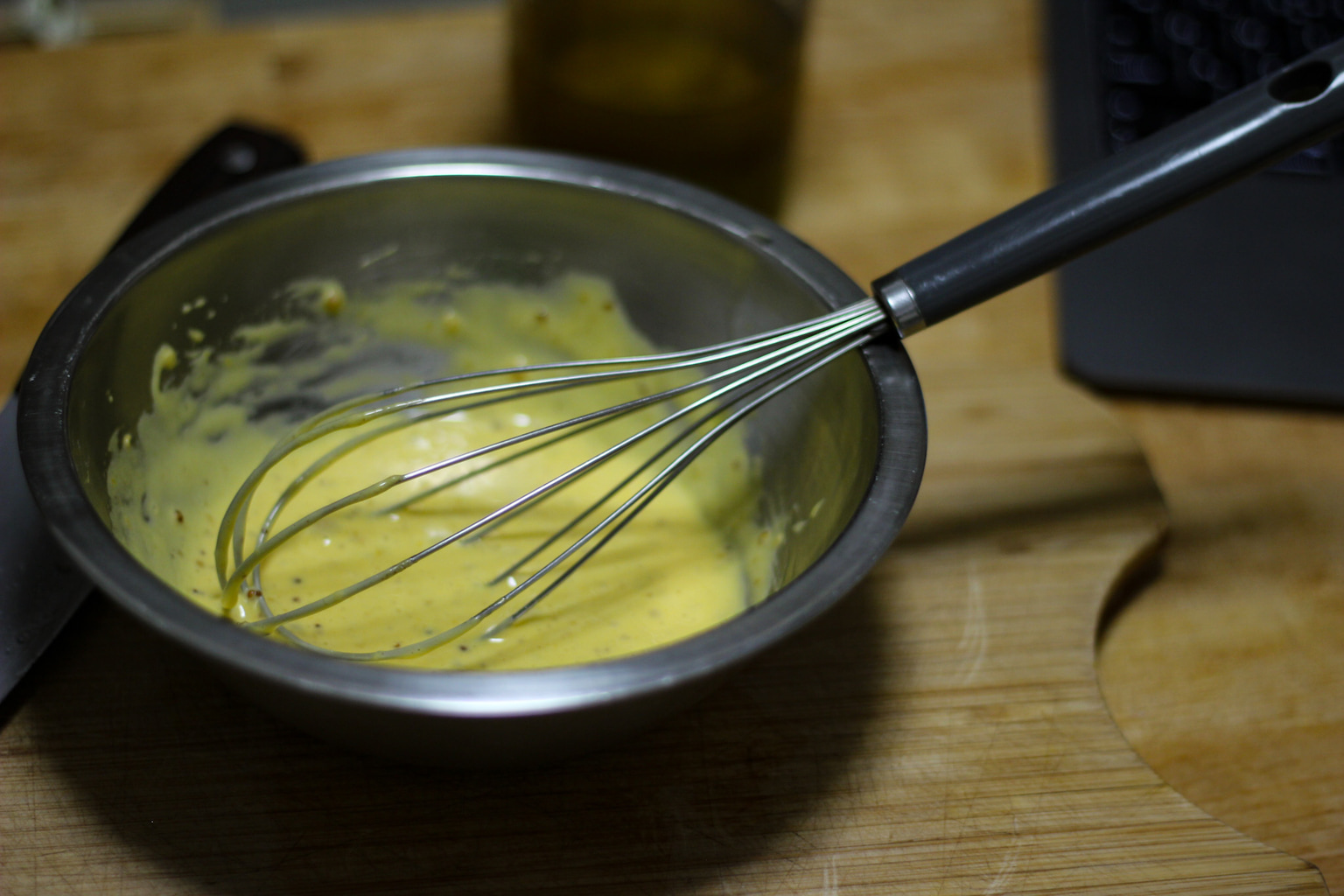 In a large bowl or mixer, place your two egg yolks and mustard and mix until well combined. Now the gauntlet begins. Slowly begin adding the oil to the egg yolk mixture, a tiny bit at a time, and mix until well combined. Be extra careful not to add too much oil at once as this will cause the eggs to curdle and leave your mixture useless.