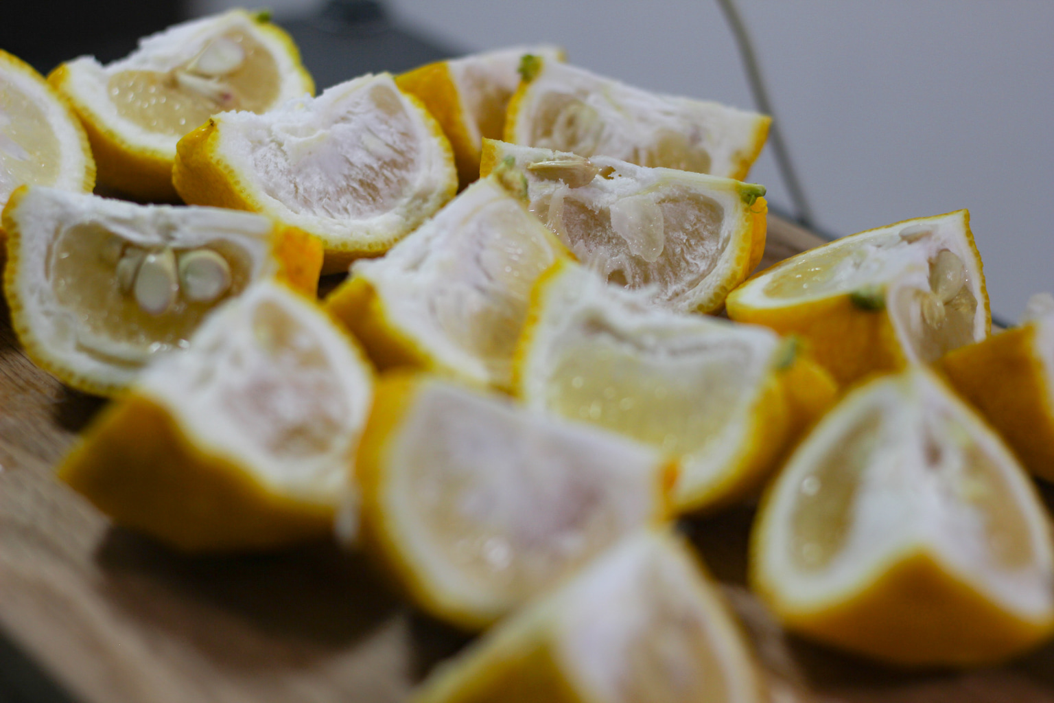 We are not, however, going to be weighing these yuzu whole — we first must break them down into a few different sections. Yuzu peel, yuzu juice and the yuzu flesh itself — we also want to keep the seeds but that doesn’t go into the final weight.