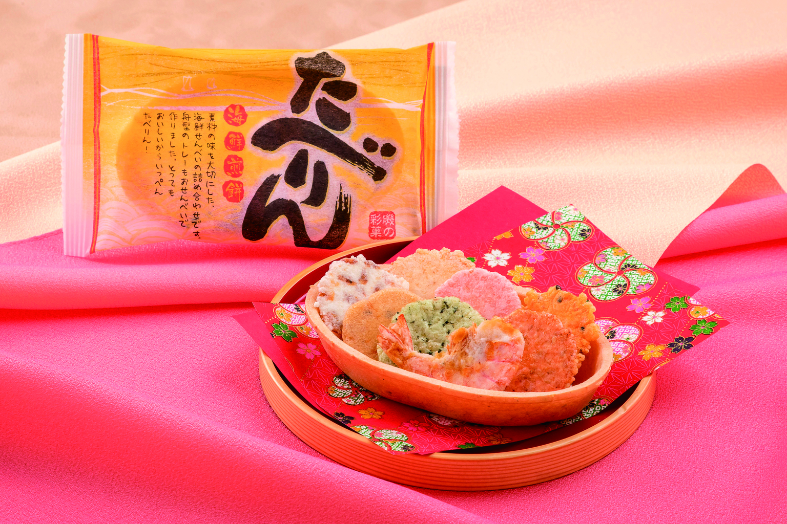 An assorted selection of senbei crackers with eight flavors including grilled shrimp, umami onion, roasted brown rice and octopus, plus a secret sauce.