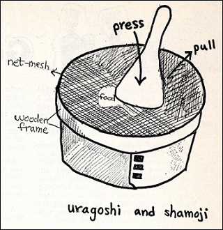 5. An uragoshi is a fine net-mesh stretched over a round, wooden frame. Foods are placed on top and forced through the mesh by pressing with a flat wooden spoon (shamoji). Good uragoshi are made of horse-hair (not nylon) and should be dampened with water before each use, (Flick away excess water with a clean cloth). Uragoshi are not cheap (average size cost about ¥2,000), but they are a delight to own—especially if you are a fan of regular mashed potatoes or other semi-pureed vegetables. Don’t forget to put a bowl underneath to catch the mashed food!