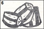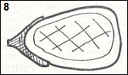 2. With a grapefruit knife, carefully cut around the rim of the eggplant, about 1/4 inch from the skin. Don’t cut too deeply or puncture the skin. Then, with a regular knife, score the surface (illustration 8) but don’t allow the scorings to reach the outer rim. The score marks should be slightly deeper in the center area, shallower around the edges. These cuts and markings allow for better cooking and easier eating later.