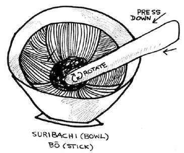 - Hold the bō (stick) with both hands one hand on top, the other down near the base. The top hand’s function is to press down, while the bottom hand rotates the stick clockwise or counter-clockwise (which ever seems easiest) against the serrated sides of the suribachi.