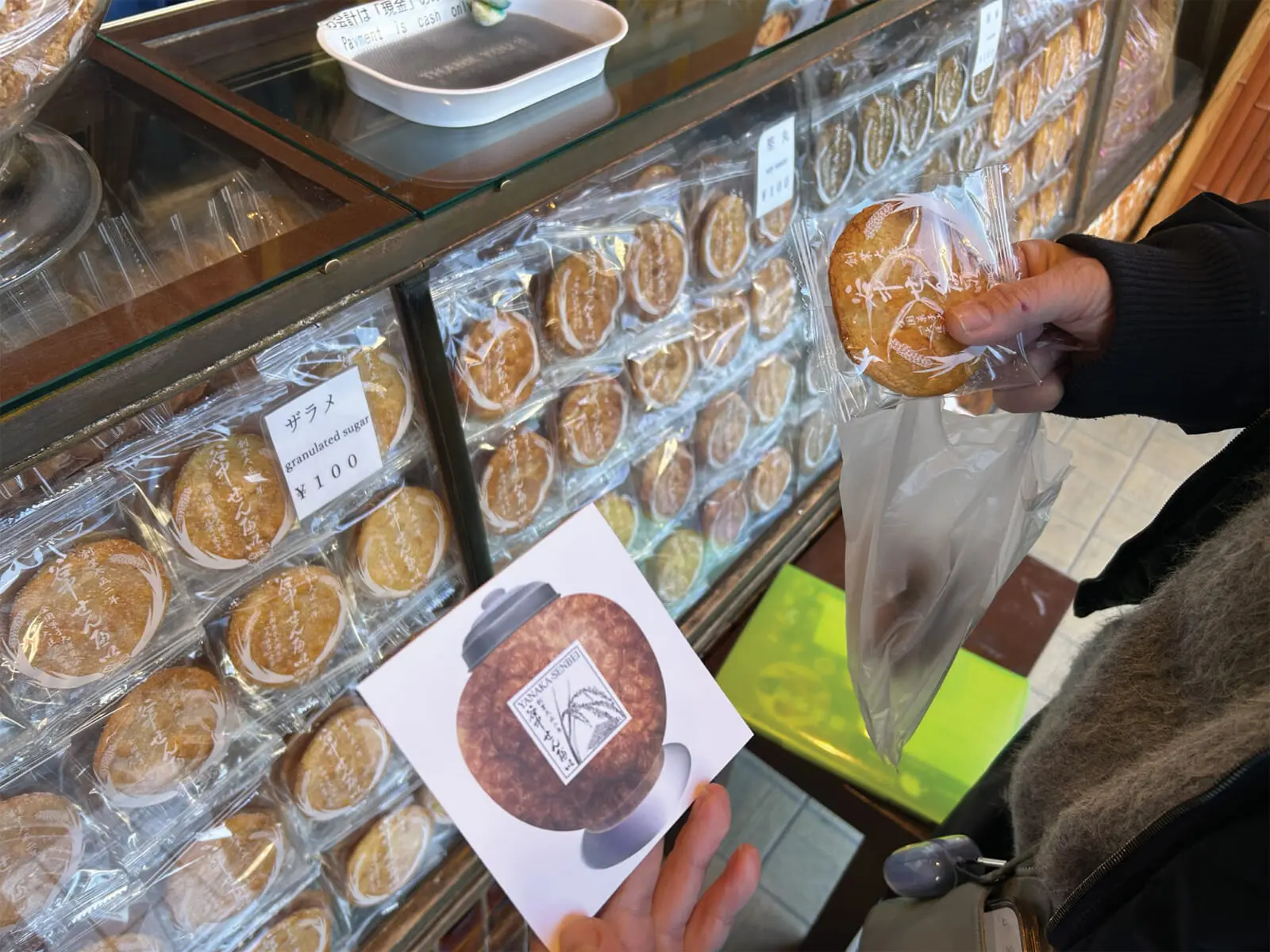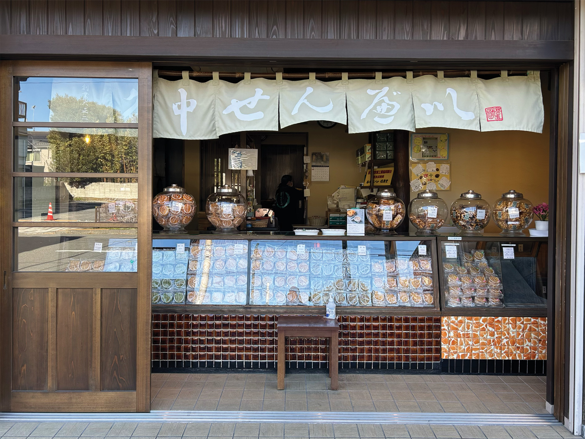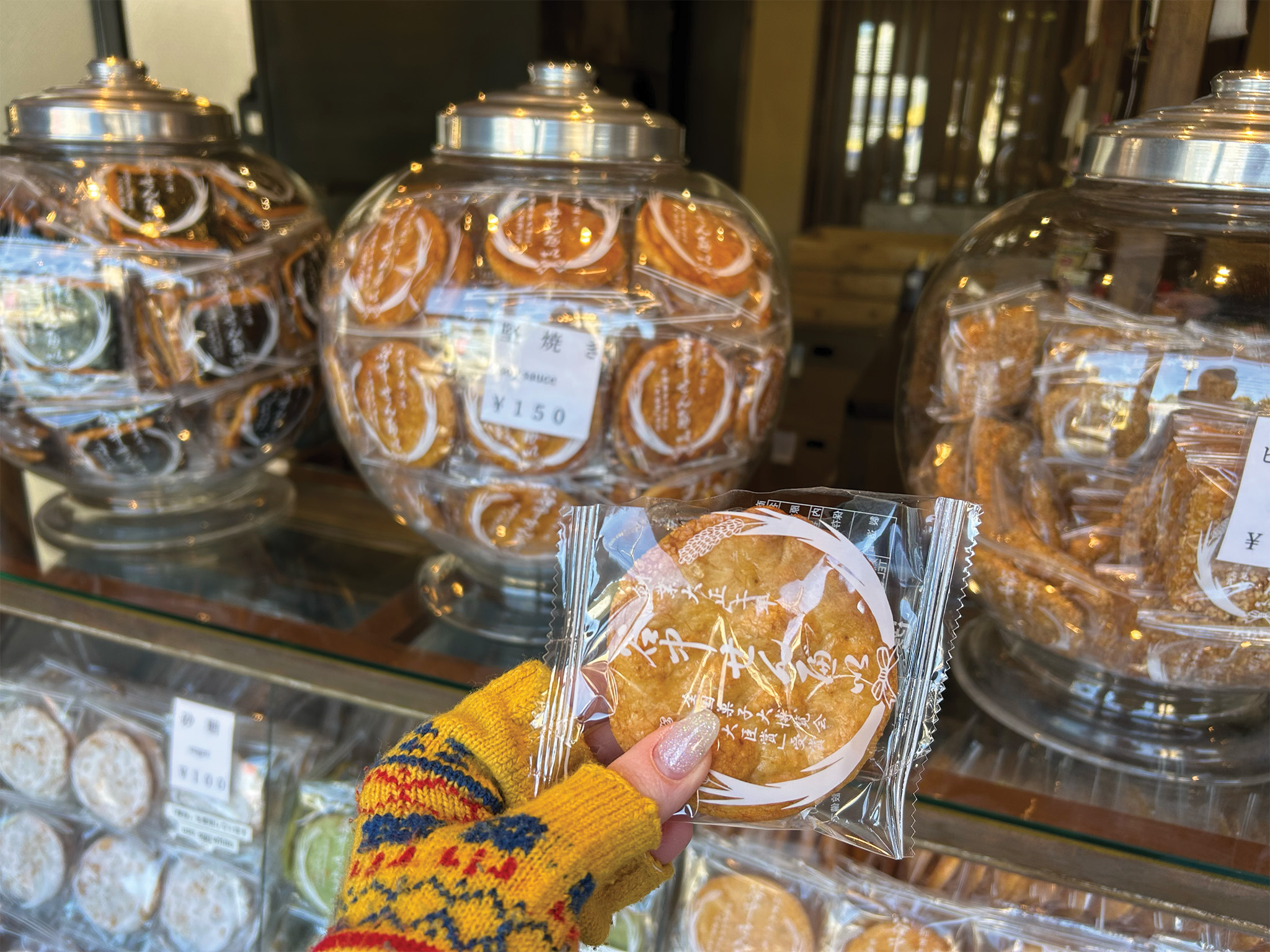“It’s believed that senbei tastes better in the winter because the dry air keeps it crunchy.” Hioki leads me to the entrance of Senbei Yanaka, a fourth-generation, family-run senbei (rice cracker) shop founded in 1914. The most popular flavor at Senbei Yanaka is the soy sauce “katamaru,” named by the owner’s grandfather. The name means “hard and round,” reflecting the cracker’s shape and texture. The senbei are incredibly crunchy, thanks to the use of high-quality Akita Komachi rice.