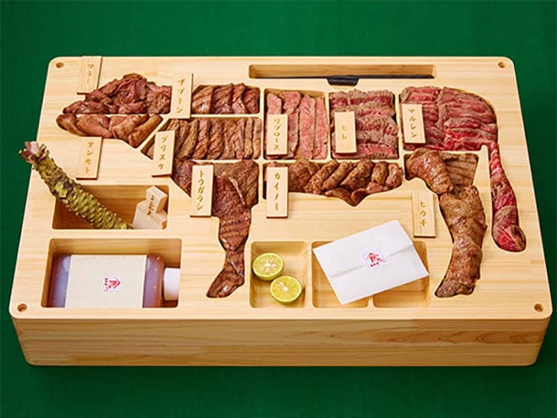 Produced by the food delivery service Gochikuru, this massive bento comes in the shape of a cow, with sections created for the various cuts of meat – ten varieties in all, from tongue to filet, weighing in at about four kilograms (nearly nine pounds). The meat is sourced from Tottori Prefecture, which has recently won awards for producing some of the country’s best wagyu, and the bento is accompanied by 1.8kg (nearly four pounds) of Kinu Musume rice, which is produced in Tottori. The bento also comes with salt, lime, tare (dipping sauce) made with local pears, and an entire wasabi – also from Tottori. The total weight of the package, all ingredients included, is about 15kg (33 pounds); the wooden box, which measures 60 centimeters (23.6 inches) across, makes up plenty of the bulk. Orders for the bento will take about two weeks to process, so unlike most bento purchases, this won’t be a spur of the moment thing.