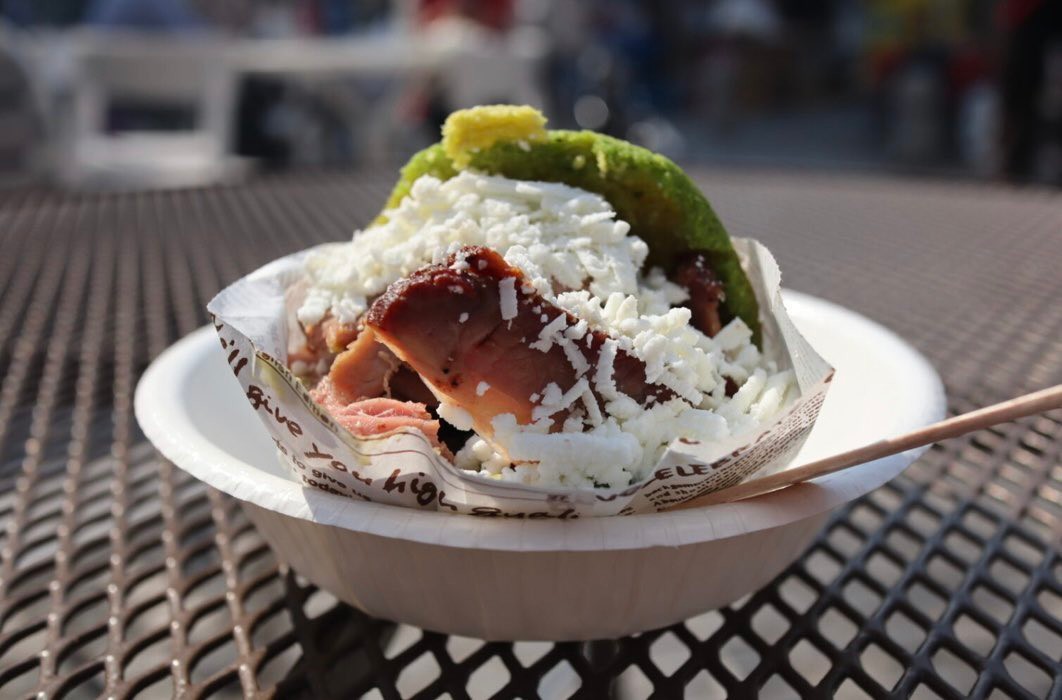 We have another one which is a very iconic arepa in Venezuela called Reina Pepiada [meaning “curvy queen”]. The name apparently came from an arepa shop in Caracas. They created the arepa honoring a Miss World [Susana Duijm, the first Venezuelan woman to win an international beauty contest]. It is pretty much an avocado chicken salad. I think it’s one of the best arepas.