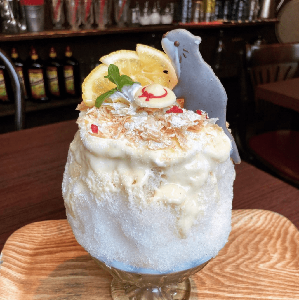Cafe Lumiere in Kichijoji pours fire over its shaved ice mountain, which has been inspired by Alice in Wonderland. The flaming red sauce changes depending on the flavor. Watch in awe as the impossible is made possible, a perfect capture for budding TikTokers, too. Not only does Cafe Lumiere serve these flaming creations, but it is also loved for its cute cake-like shaved ice. These often feature homemade animal biscuits perching on top of a mound of delicious dessert.