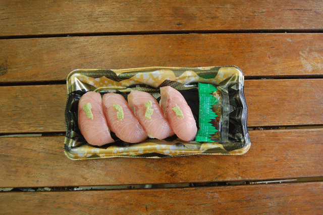 For many, sushi is an expensive delicacy reserved for special occasions but at the Outer Market excellent sushi can be had at reasonable prices. I couldn’t pass up some buri (yellowtail) from Niigata in a building that housed booths from various prefectures conveniently located next to a rest area where I consumed it.