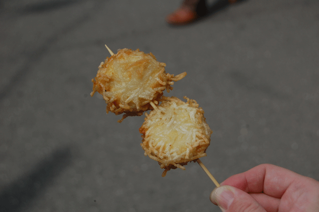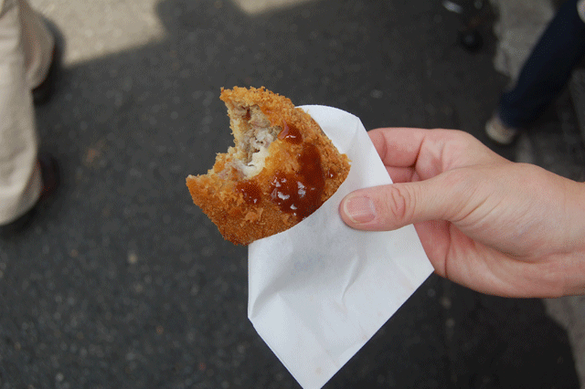 Much to my delight a shop was selling menchi katsu with cheese inside (I’m a pushover for anything with cheese in it).