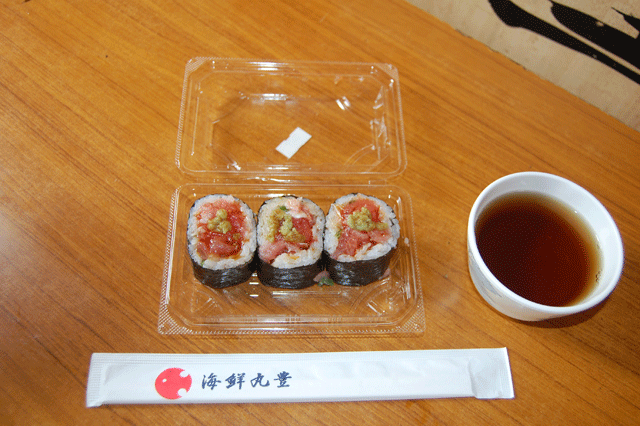 Close by another shop was selling packs of negi toro (chopped tuna belly with green onion) that were a bargain at 200 yen for three pieces with some complimentary tea.
