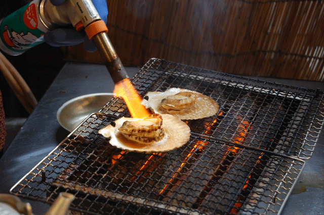 Scallops are one of my favorite shellfish and I was pleased to find some being grilled on the half shell with soy sauce and sake in front of customers. The chef put on a good show pouring the soy sauce and sake from high up and finishing off the bubbling mixture with a blow torch. The small tables located behind the grill were the perfect place to stand and consume the delicacy.