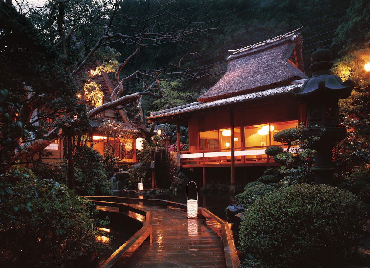 Situated in a dense, verdant forest close to Mt Takao, Ukai Toriyama is sprawled across a magnificent 20,000m² stretch of land and boasts a collection of quaint private tea houses with floor-to-ceiling windows that overlook a delightful manicured water garden. There are carp-filled ponds, pine trees, gentle streams, stone pathways, Japanese-style bridges, water wheels and thatched-roof buildings known as Gassho-zukuri, which have been imported from Gokayama.