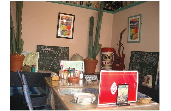 Big table in back, by the cactus, giant Tecate can and red guitar.