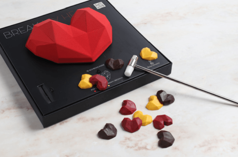 Break a heart this Valentine — ideally with a small metal hammer. This vivid red heart is the innovative creation of Bubo Barcelona, a Spanish patissier that likes to break the mold. Break the dark chocolate heart with its accompanying hammer to reveal three types of color heart bonbons inside in brownie, macadamia, and pop rock flavors. Perfect for the in love and lovelorn alike.