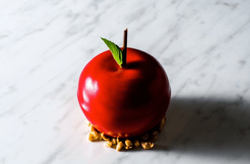 Surprise and delight the apple of your eye with a playful Valentine’s Day dessert. This apple-shaped cake is made with a rich apple compote, encompassed in a creamy milk chocolate and caramel mousse coating.