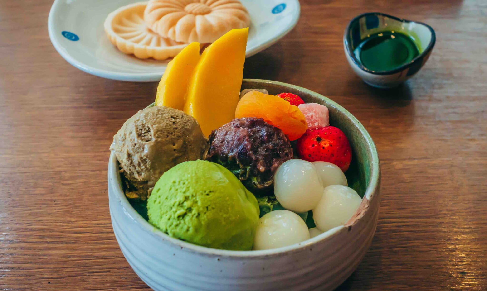 Anmitsu is a dessert bowl made of various components, typically consisting of anko, kuromitsu, fruits, cubed kanten (agar jellies) and shiratama (dango balls) for a symphony of flavors.