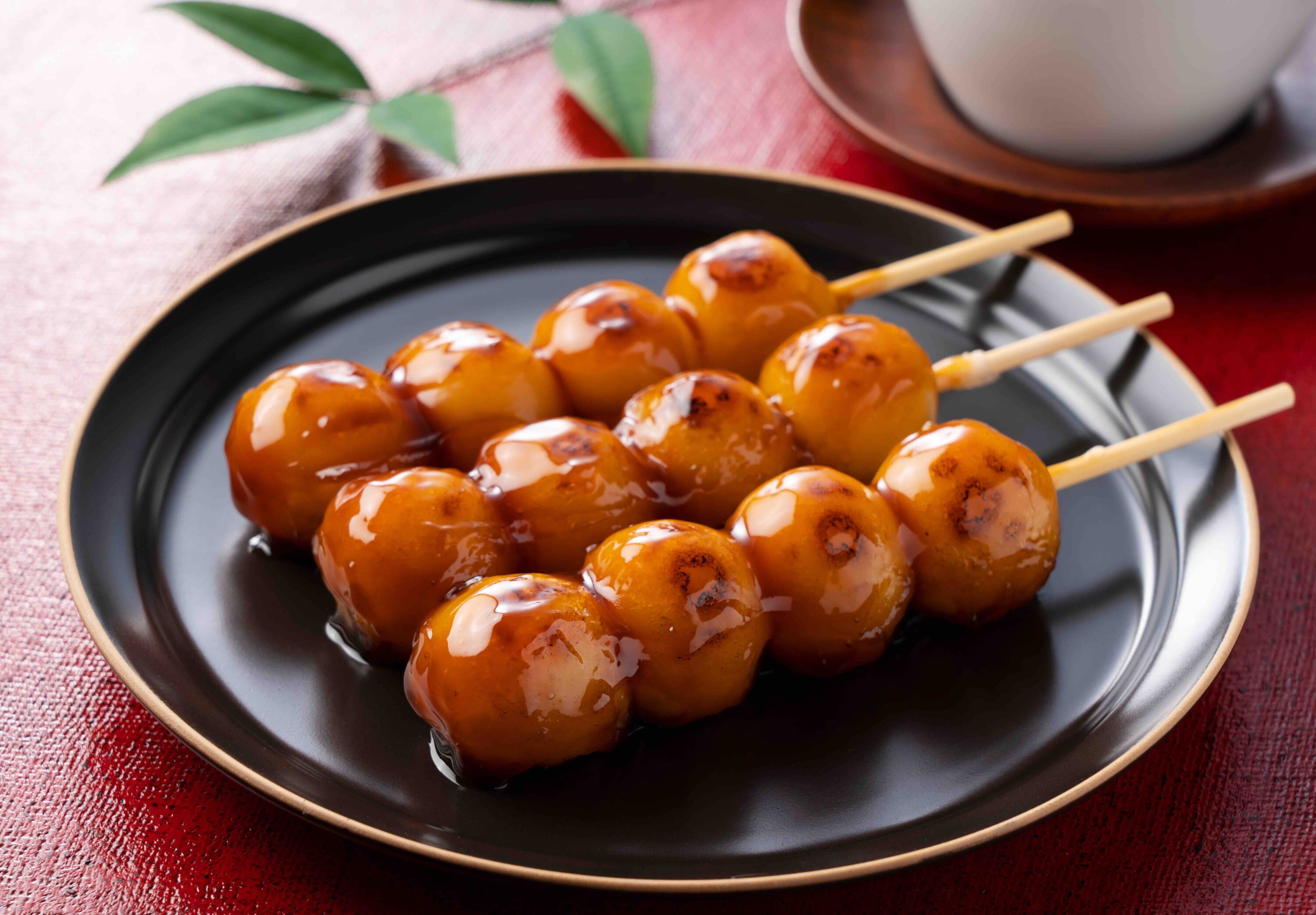 Dango is closely connected to mochi. Taking the pounded mochiko (rice flour), the dough is then rolled into small bite-sized pieces, steamed and served on bamboo skewers. Varieties include mitarashi dango which are dipped in a sweet soy sauce glaze. Anko dango have a sweet bean paste topping and kuri dango have chestnut puree, an autumn favorite. Hanami dango have a stack of green, white and pink dumplings symbolizing springtime blossoms. As their name suggests, these dango are popular for hanami (flower viewing) and they are even represented in the emoji keyboard.