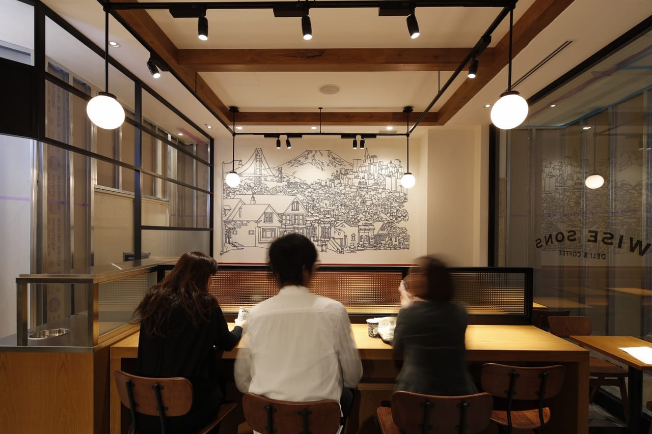 As Joey explained, the newly opened shop was a while in coming. It all started when Wise Sons co-founder Evan Bloom was visiting Japan on his honeymoon about three years ago. He happened to take a meeting with a restaurant “fixer” – someone who helps foreign restaurants launch locations in Japan – while he was there. He explained the concept and the restaurant’s menu items, and didn’t figure anything would come of it. After a while, though, he got an email from the fixer with news that they’d found a partner – Giraud, a business that has brought a number of Italian restaurants to Tokyo. After arranging a tasting, things moved pretty quickly, and led to them opening what’s actually their largest restaurant, and one that they designed completely to their liking, an option that they hadn’t had at many of their locations back in the States. The shop is decorated with plenty of cool California touches, but the thing that definitely got our attention was a giant mural that covers one wall, featuring parts of San Francisco’s skyline with Mt. Fuji looming in the background. If you look closely, you can even spot a kaiju walking along, munching on a bagel.