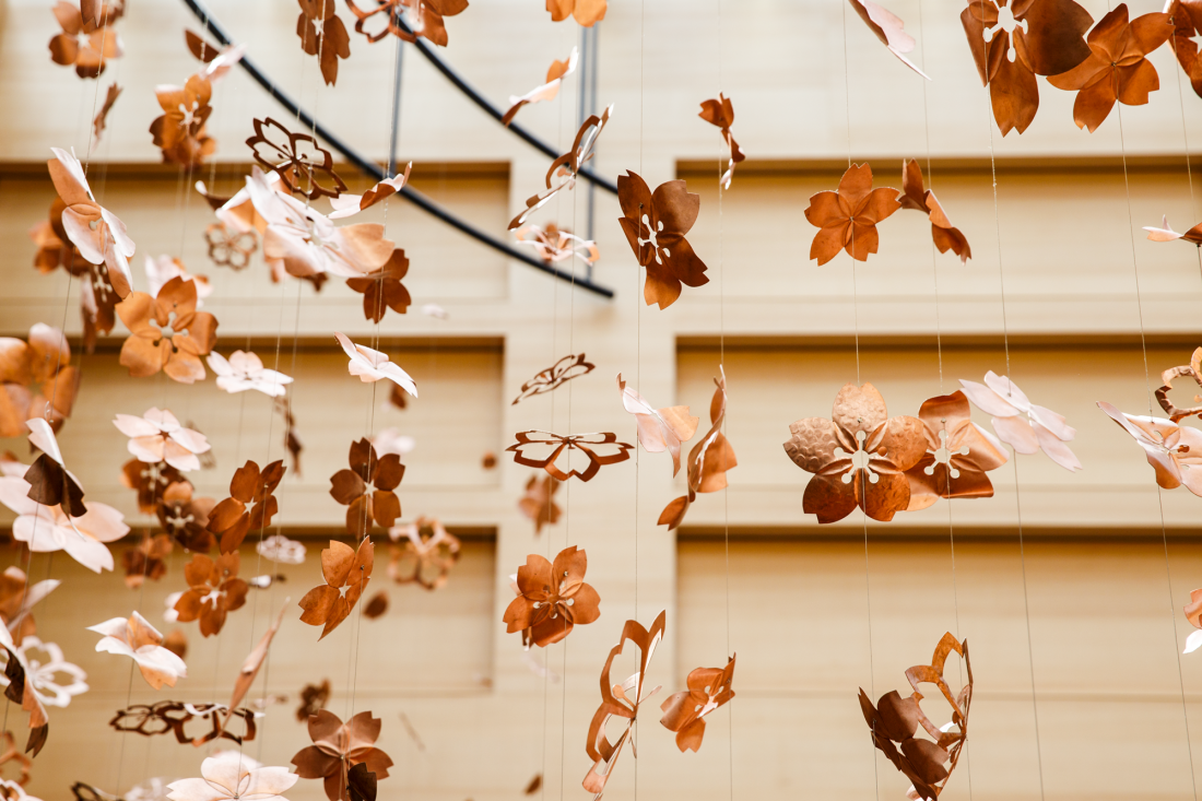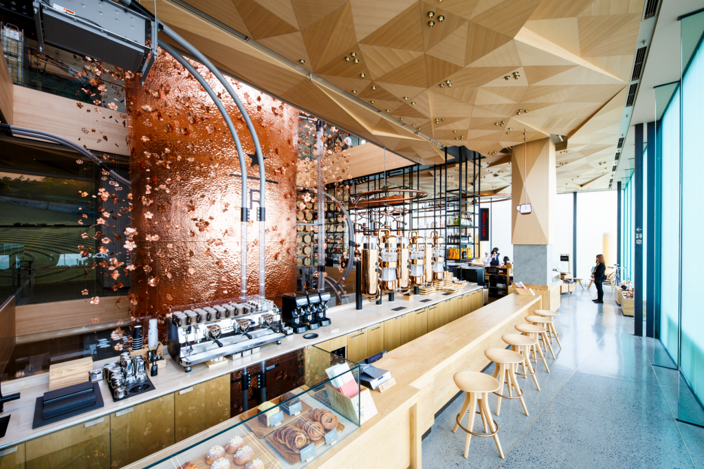 And what is more Japanese than its national emblem the cherry blossom. Sculpted in thin copper sheets, and hung from the ceiling, the whiskey barrel is decorated with falling petals for a delicate touch. Another design element inspired by the Japanese arts is the ceiling. Meant to mimic the folded paper in origami, it is not only beautiful to look at but under every plank, are speakers. Yes, the ceilings of the roastery are covered in speakers.