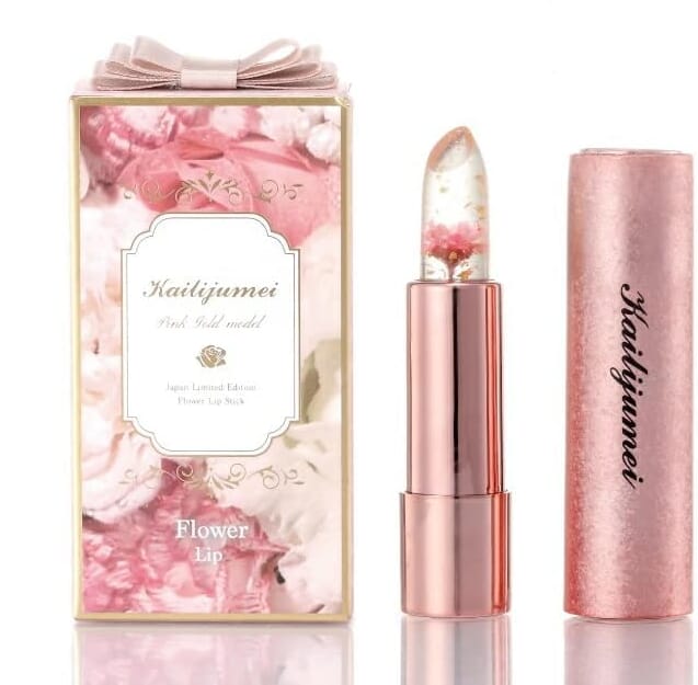 Suspended inside clear jelly, each lipstick contains a real dried flower and reacts to your pH to create a custom pink shade, making it as fun as it is moisturizing.