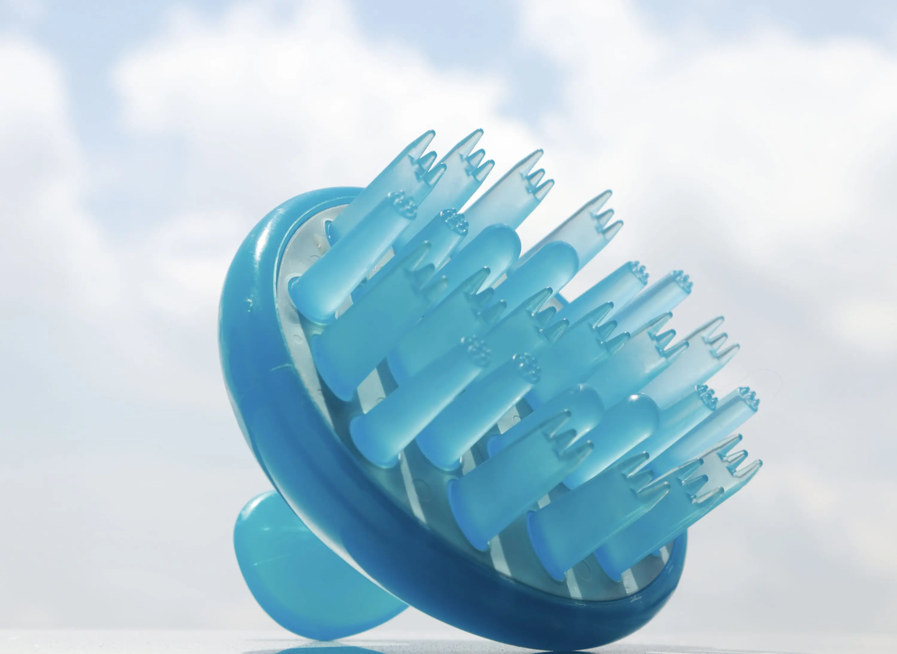Japanese has a rich variety of onomatopoeia, including goshi goshi (“scrub scrub”), which is the name I’ve given my scalp brush. Commonly made from resin and silicone, scalp brushes are very popular in Japan, and are used to increase blood circulation, promote hair growth, exfoliate dead skin cells and help loosen any clogged pores. Concave to fit the shape of the skull, the scalp brush I use has been designed to prevent hair damage with its three kinds of prongs, which take the form of a fork, a bulb and a tiny, raised flower.